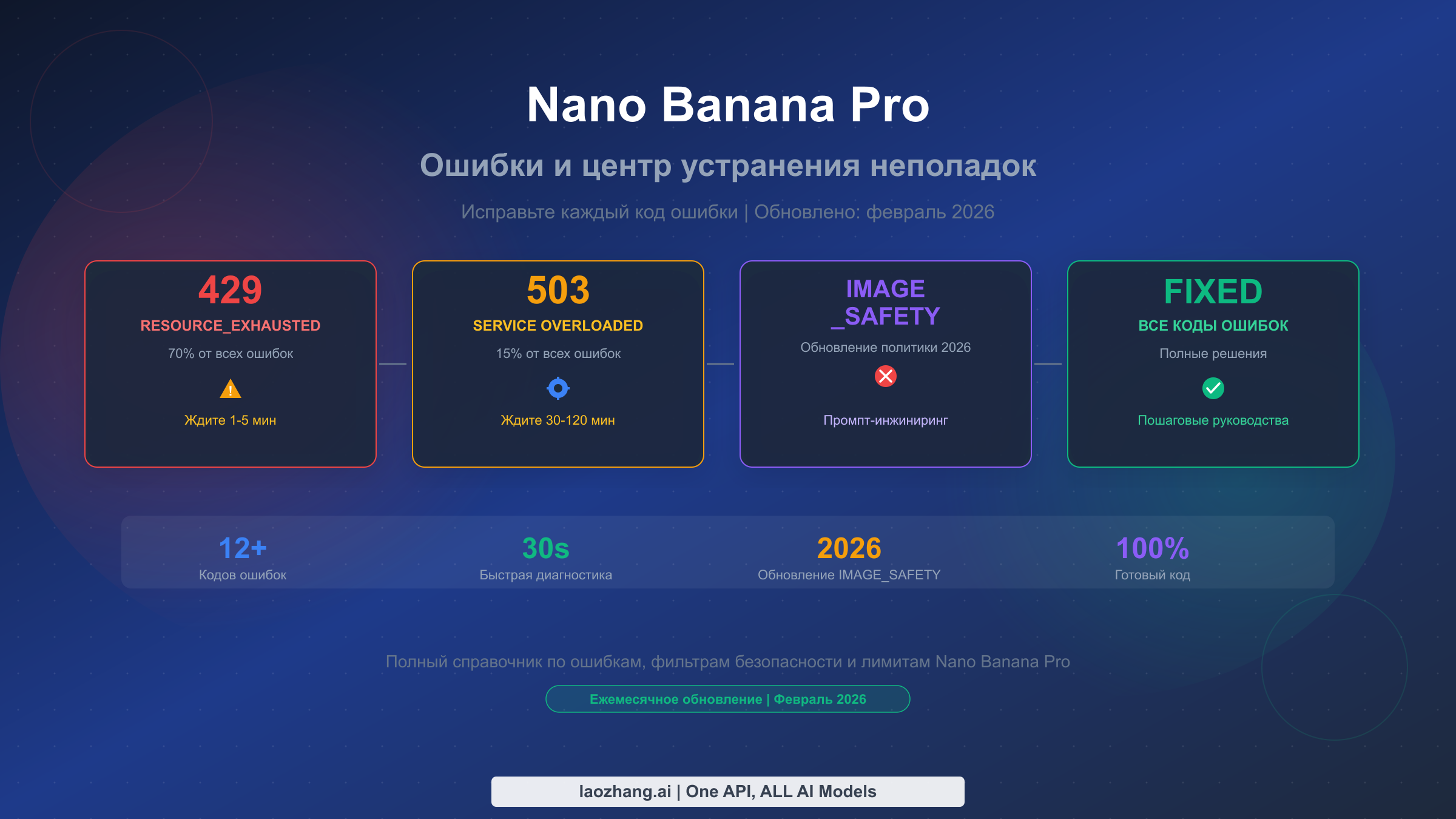 У каждой ошибки Nano Banana Pro есть решение. Ошибки лимита запросов (429 RESOURCE_EXHAUSTED) составляют примерно 70% всех сбоев и обычно устраняются в течение 1-5 минут. Серверные ошибки (503) требуют 30-120 минут ожидания. Блокировки фильтров безопасности делятся на два уровня: настраиваемые (исправляются через параметры API) и ненастраиваемые (требуют изменения промпта). В этом руководстве рассмотрены все известные коды ошибок, обновление политики IMAGE_SAFETY от января 2026 года и готовый для продакшена код автоматической обработки сбоев. Последнее обновление — февраль 2026.