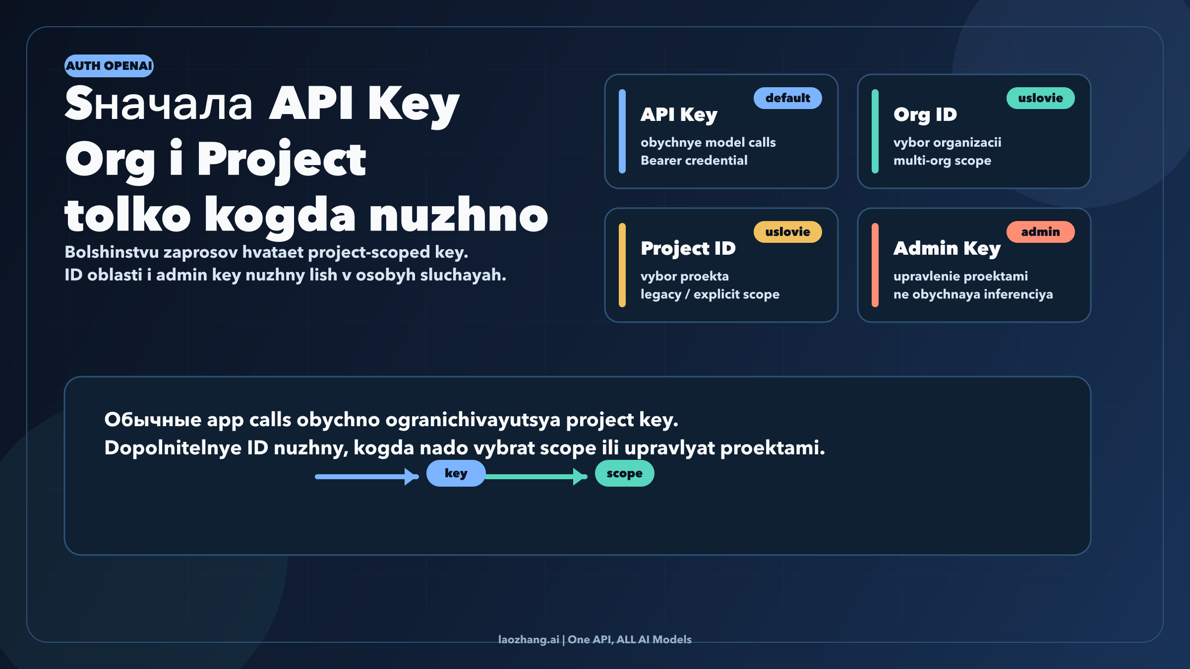 Формулировка маленькая, но она решает почти всю тему. Как только вы принимаете эту модель, текущая платформа OpenAI перестает выглядеть как куча пересекающихся полей. Project-scoped key становится default path для обычных application calls. Org и project IDs превращаются в явные controls routing для тех случаев, где они действительно нужны. А admin keys оказываются там, где им и место: credentials management plane, а не универсальный ответ на auth в OpenAI.