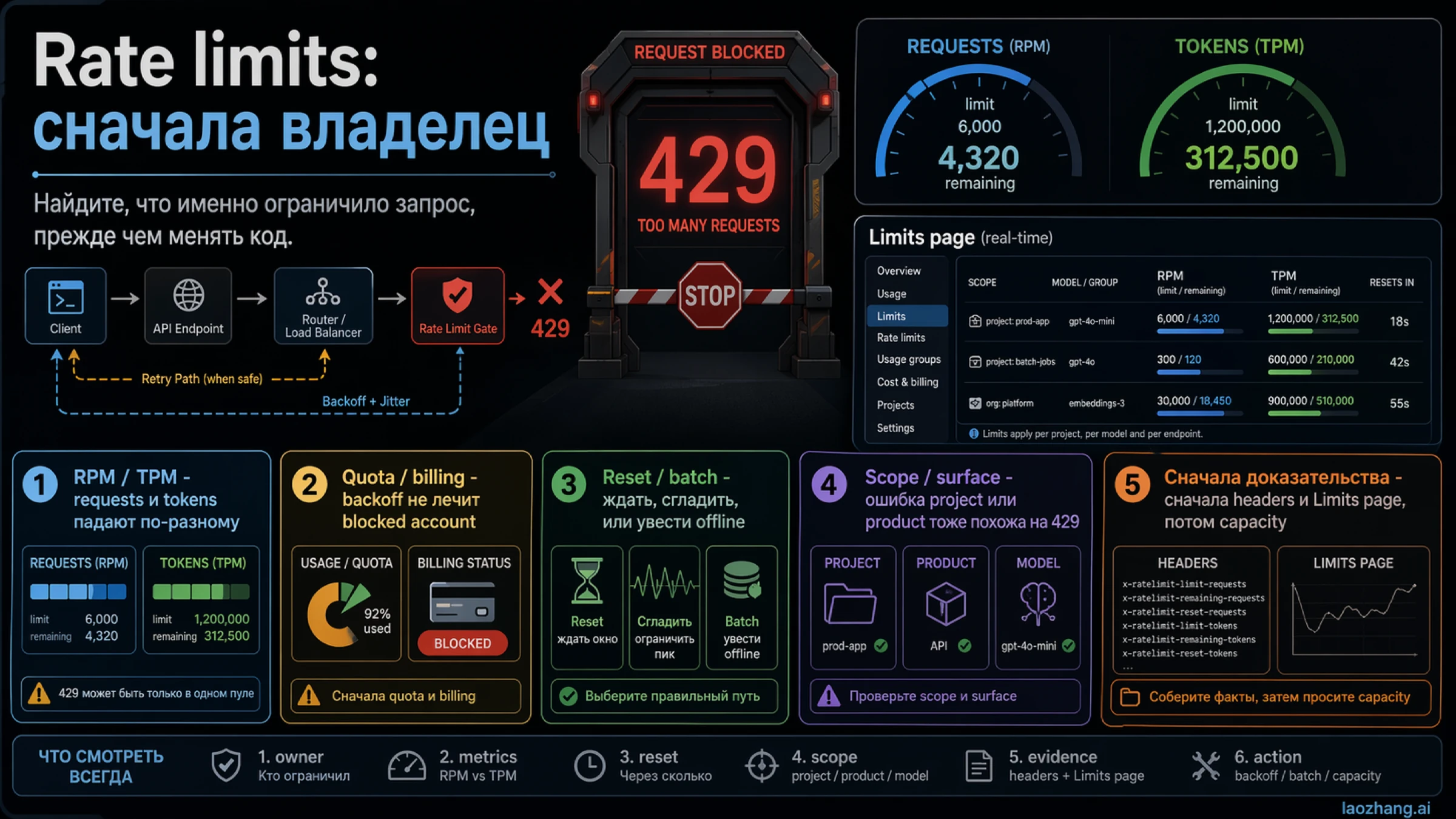 Полезный первый вопрос звучит не как "какой лимит у OpenAI API", а как "какой лимит сработал на этом запросе". Request-rate owner и token-rate owner обе возвращают 429, но ведут к разным исправлениям. Quota или billing owner тоже может выглядеть как rate problem, но backoff там не лечит корень. Неверный project, org, model или endpoint могут делать вид, что речь о capacity, хотя в реальности проблема в scope.