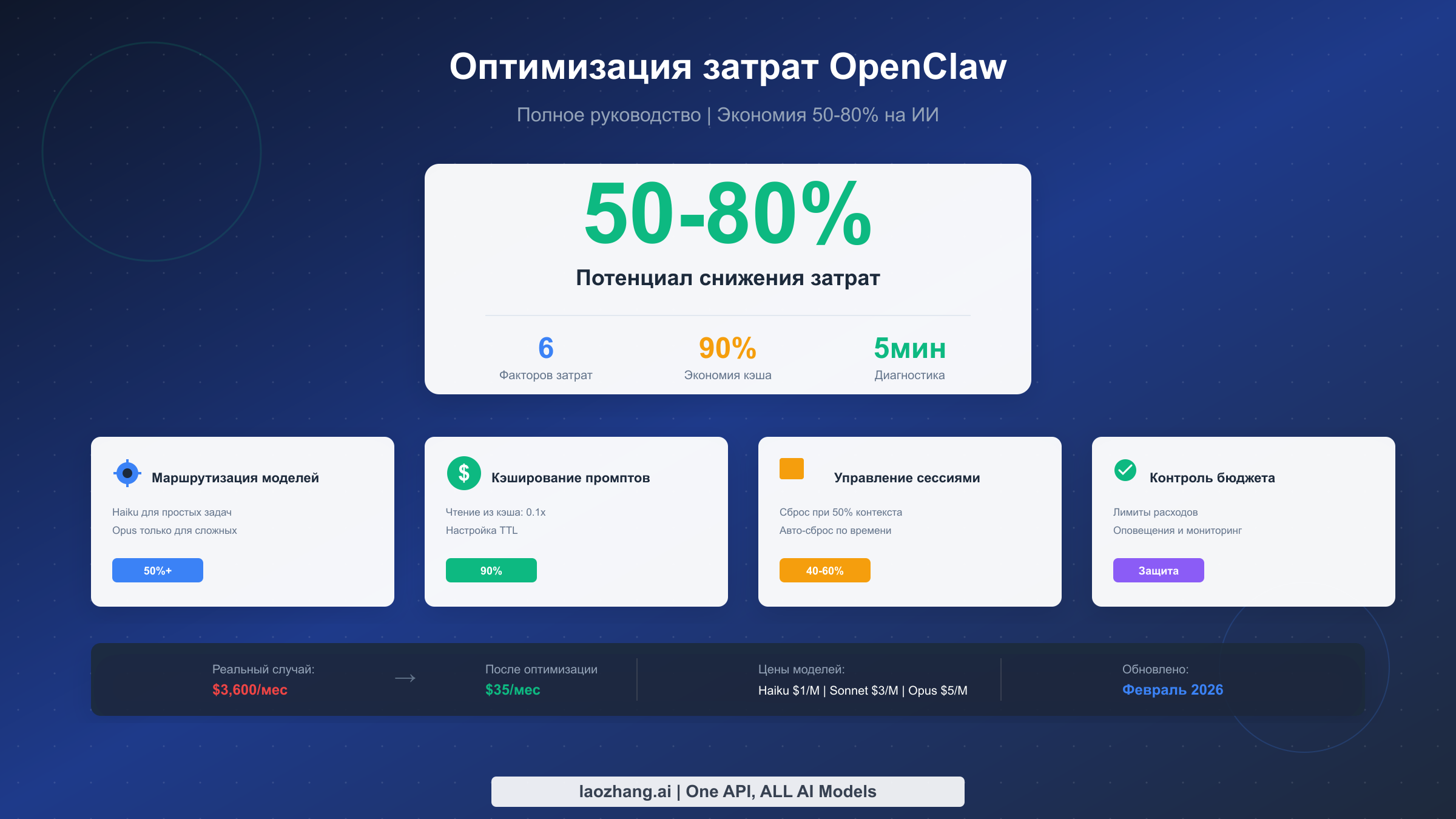 Пользователи OpenClaw часто сталкиваются с неожиданно высокими счетами за API, некоторые сообщают о затратах более $3,600 в месяц из-за неконтролируемого потребления токенов. Этот ИИ-ассистент с открытым исходным кодом стал невероятно популярным, набрав более 135,000 звёзд на GitHub, но его скорость потребления токенов застаёт многих пользователей врасплох. Это полное руководство раскрывает 6 основных факторов затрат — от накопления контекста, потребляющего 40-50% ваших токенов, до неправильно настроенных heartbeat-запросов, тихо истощающих ваш бюджет — и предоставляет практические стратегии для снижения затрат на OpenClaw на 50-80%. Вы получите полные шаблоны конфигурации для умной маршрутизации моделей, кэширования промптов и контроля бюджета, обновлённые на февраль 2026.