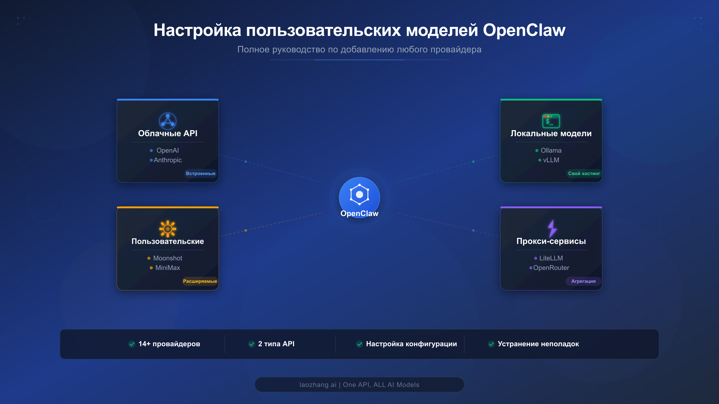 OpenClaw поставляется со встроенной поддержкой четырнадцати провайдеров, включая OpenAI, Anthropic, Google Gemini и OpenRouter, но настоящая мощь раскрывается при добавлении собственных. Будь то подключение приватного развёртывания vLLM за корпоративным файрволом, маршрутизация через LiteLLM для единого биллинга нескольких поставщиков ИИ или интеграция совершенно нового провайдера вроде Moonshot AI Kimi K2.5 до выхода официальной поддержки в очередном релизе -- конфигурация models.providers в файле openclaw.json делает всё это возможным с помощью нескольких строк JSON. В данном руководстве подробно разбирается каждый параметр конфигурации с понятными пояснениями, приводятся проверенные и работающие примеры для пяти различных типов провайдеров от облачных API до локальных серверов инференса, а также описываются шаги по устранению наиболее распространённых ошибок, которые ни один другой ресурс не объединяет в одном месте. К концу этого руководства вы будете точно знать, как добавить любую OpenAI-совместимую или Anthropic-совместимую модель в OpenClaw, настроить мультимодельную маршрутизацию для оптимизации затрат и отладить проблемы конфигурации при их возникновении.