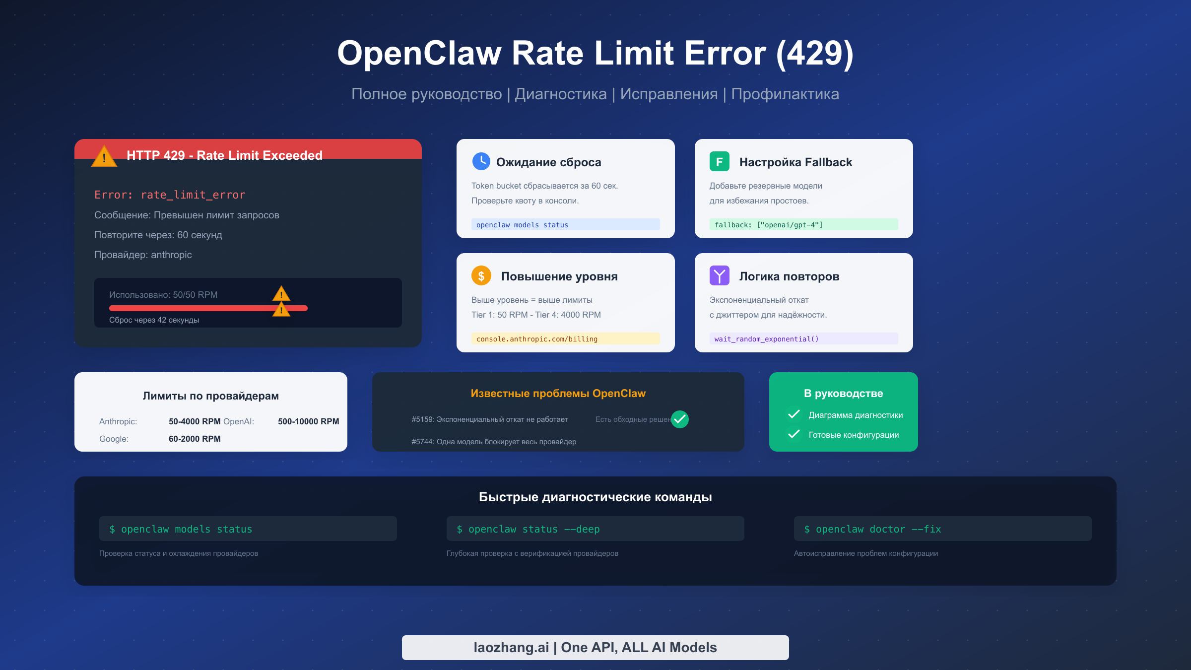 openclaw models status(проверка охлаждения),openclaw status --deep(верификация провайдеров),openclaw doctor --fix(автоисправление)