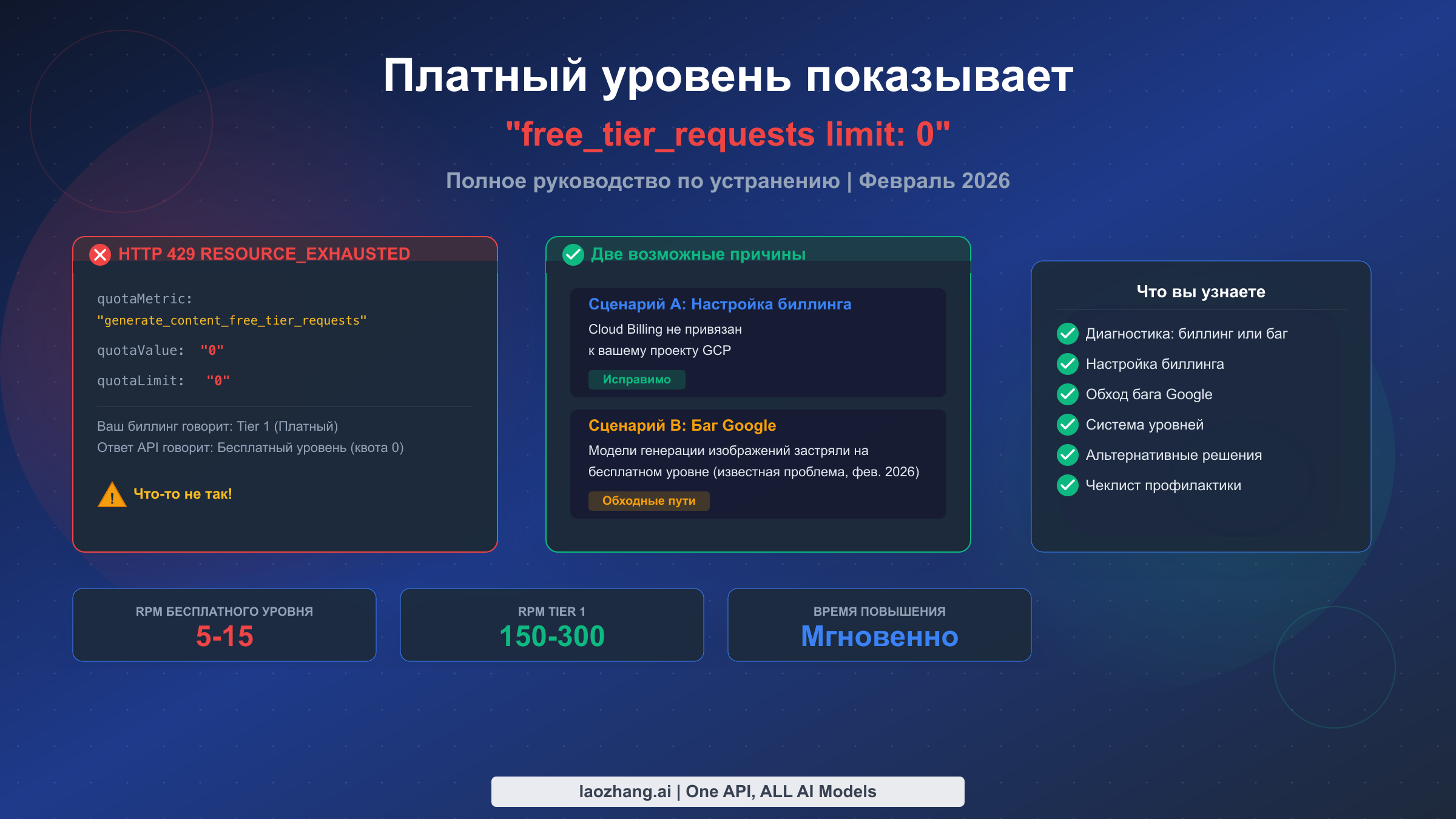 Ошибка «free_tier_requests limit: 0» на платных аккаунтах Gemini API имеет две основные причины. Самая распространённая из них, на которую приходится примерно 60% случаев, заключается в том, что Cloud Billing фактически не привязан к проекту GCP, связанному с вашим API-ключом. Исправление занимает пять минут: перейдите в Google Cloud Console, привяжите платёжный аккаунт к проекту, создайте новый API-ключ и проверьте повышение уровня. Вторая причина, затрагивающая около 25-40% недавних случаев, — это настоящий баг платформы Google, при котором модели генерации изображений, такие как gemini-2.5-flash-image и gemini-3-pro-image-preview, остаются на квотах бесплатного уровня, даже когда биллинг правильно настроен. Для этого сценария обходные пути включают использование текстовых моделей, которые работают корректно, миграцию на эндпоинт Vertex AI или использование стороннего прокси-сервиса API. Оставшиеся случаи связаны с API-ключами, созданными до включения биллинга, что решается простым созданием нового ключа после активации биллинга.