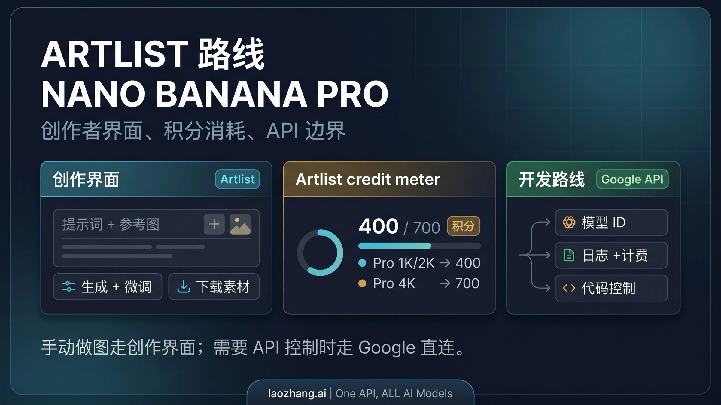 在 Artlist 里用 Nano Banana Pro,先把它当成一条创作者工作流,而不是 Gemini API 的同一份调用合同。Artlist 当前 Help 文档把 Nano Banana Pro 的 1K/2K 输出列为 400 积分,4K 输出列为 700 积分;Nano Banana 2 是 150 积分。需要文字、复杂版式、4K 或客户交付时再用 Pro;还在试方向时先用 Nano Banana 2;要代码、日志、模型 ID 和 Google 计费时走 Google AI Studio 或 Gemini API。