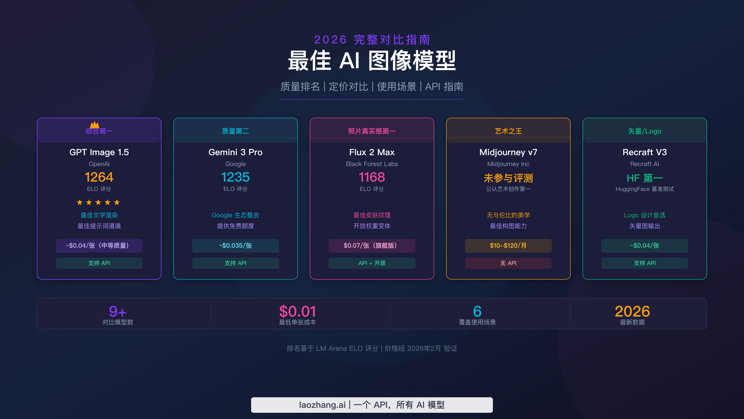 截至2026年2月,GPT Image 1.5以1264的ELO评分领跑LM Arena排行榜,但最佳AI图像模型完全取决于你的使用场景。追求照片级真实感,Flux 2 Max表现卓越;做艺术创作,Midjourney v7仍然无可匹敌;论文字渲染能力,GPT Image 1.5和Ideogram 3.0并驾齐驱。本文从质量、定价、速度和API接入四个维度全面对比所有主流模型,帮你做出正确选择。