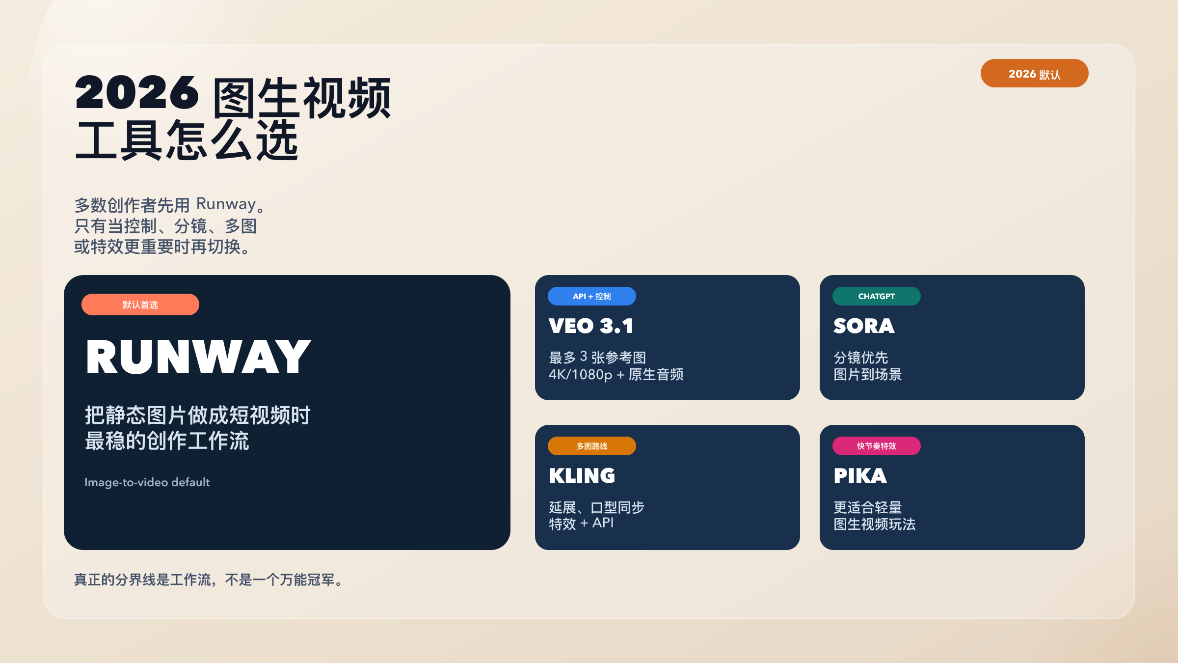 如果你在 2026 年只想先开一个图生视频 AI,先从 Runway 开始。对大多数创作者来说,它是目前最稳的默认项:不用一上来就进入 API 思维,不需要先接受受限地区的应用入口,也不用先跳进一个明显偏特效或偏玩法的平台。真正需要别的工具时,再切换就够了。切换规则也很清楚:要 API 级参考图控制和原生音频,用 Veo 3.1;已经在 ChatGPT 里工作、而且更看重分镜流程,用 Sora;需要多图运动、延展、口型同步或效果玩法,用 Kling;想要更轻、更快、更像实验台的图生视频,用 Pika。