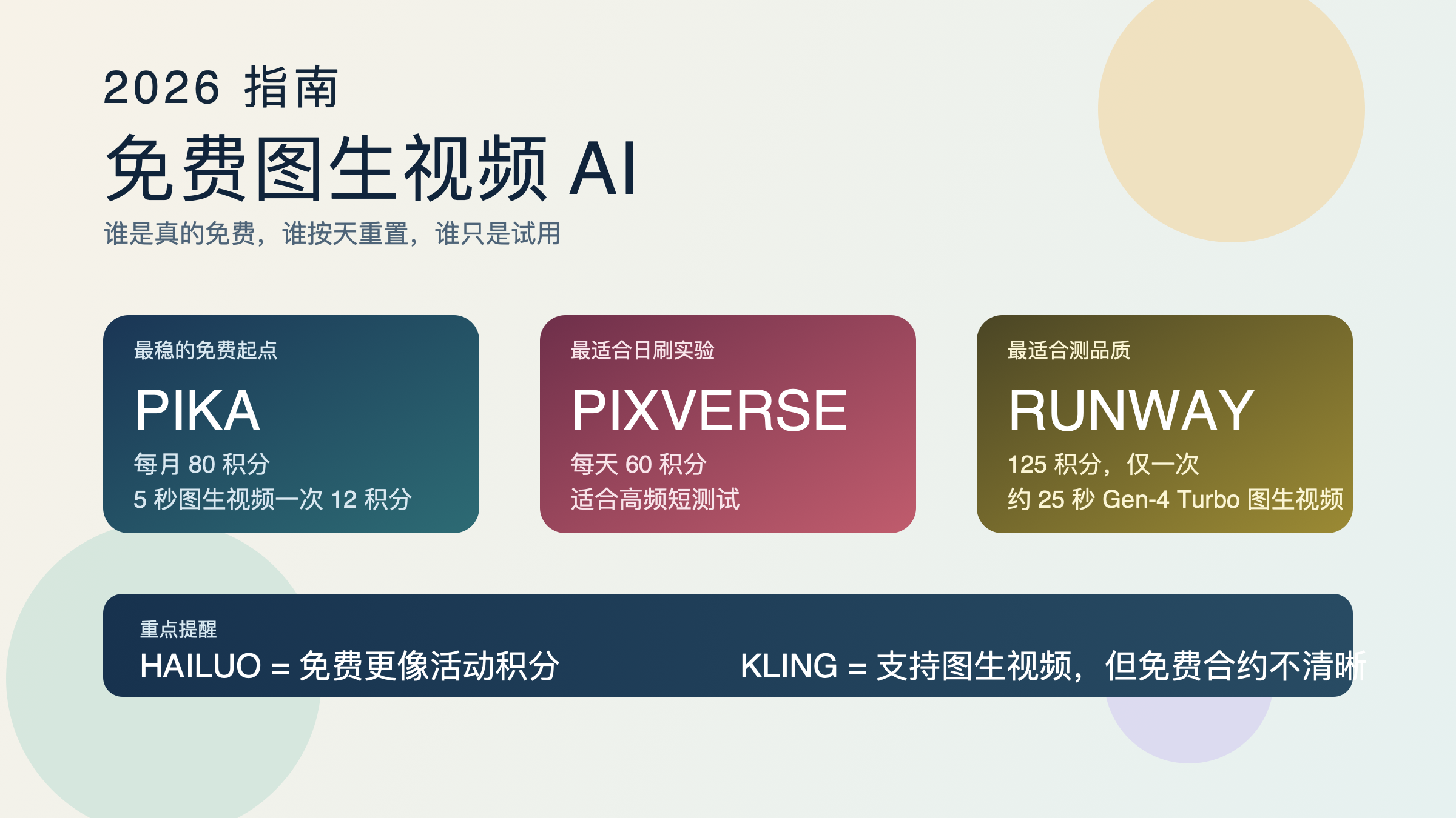 | 你想找一个不用付费也还能持续用一阵的起步方案 | Pika | 官方公开了 80 月度视频积分,而且公开了图生视频的免费消耗规则 | 如果你高频迭代,月度总量还是会很快见底 |
