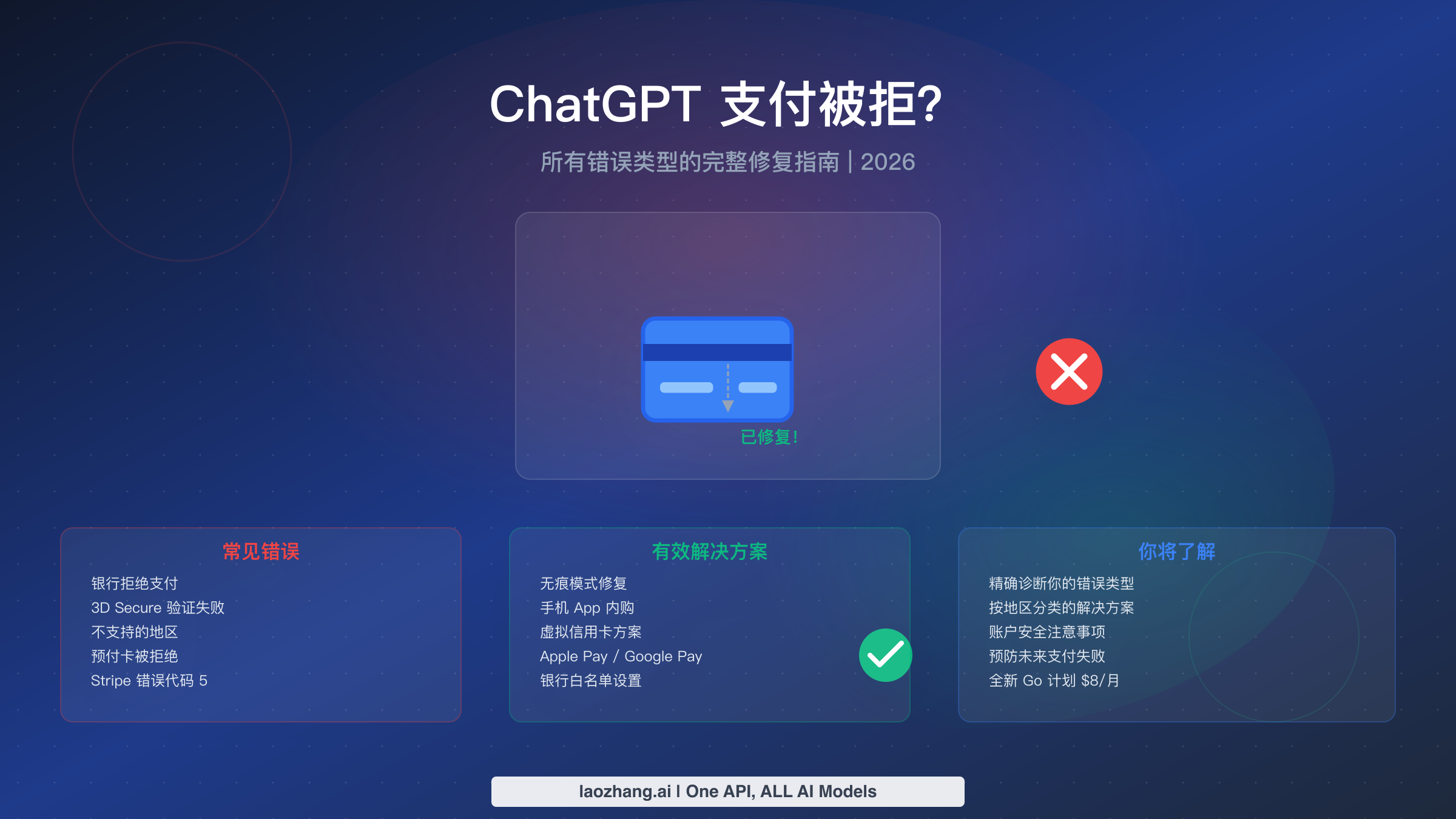 ChatGPT 付款被拒是一件非常令人头疼的事,尤其是当你急需将它用于工作或学习的时候。好消息是,几乎每种支付失败都有对应的解决办法,而且大多数问题可以在五分钟内搞定。最常见的原因是你的银行将 Stripe 发起的国际扣款标记为可疑交易。Stripe 是 OpenAI 在美国的支付处理商,负责处理所有 OpenAI 的支付请求。信用卡的支付成功率约为 78%,而借记卡只有 61% 左右,所以仅仅是换一张信用卡就能解决很多问题。如果你的银行卡反复失败,可以尝试通过 ChatGPT 手机 App 使用 Apple Pay 或 Google Pay 支付。这种方式完全绕过了传统的银行卡处理流程,根据社区数据统计,成功率高达 83%。对于支付成功率较低地区的用户来说,来自 Wise 或 Revolut 等服务商的虚拟卡是成功率最高的选择,大约能达到 89%。OpenAI 还推出了 ChatGPT Go 计划,每月仅需 8 美元(openai.com/chatgpt/pricing,2026 年 2 月),这是一个更实惠的入门选择,由于扣款金额更低,银行风控系统拦截的可能性也更小。如果你需要的是 API 接入而非 ChatGPT 订阅服务,像 laozhang.ai 这样的 API 聚合平台接受更多种类的支付方式,可以完全避开 OpenAI 直接计费的复杂流程。
