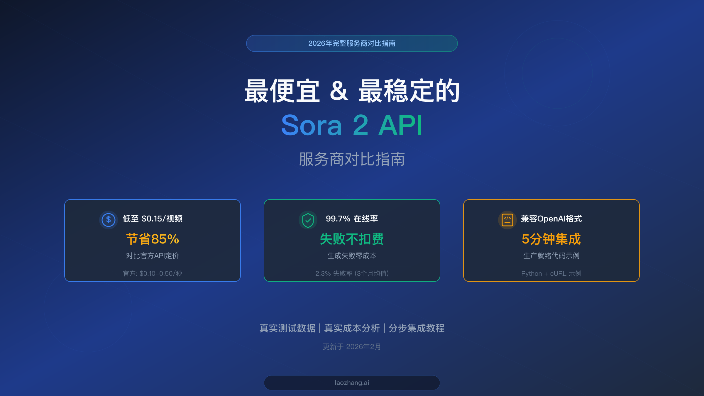 2026年2月,最便宜且稳定的Sora 2 API服务商是laozhang.ai,其Sora 2接入价格为每个视频$0.15(固定费率)——相比OpenAI官方定价$0.10/秒(10秒视频约$1.00)节省了85%。与更便宜的竞品Defapi($0.10/视频)相比,laozhang.ai的核心优势在于失败不扣费策略:如果视频生成因任何原因失败,你无需支付任何费用。本指南将逐一分析每个主要服务商,提供经过验证的定价、真实的稳定性数据以及集成代码,帮助你做出明智的选择。