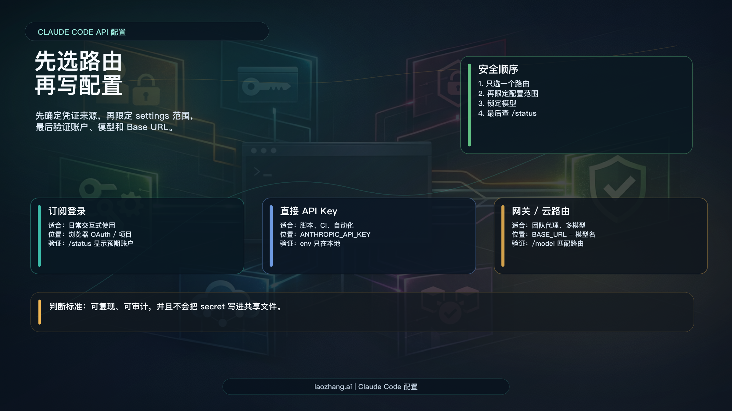 Claude Code API 配置不要从粘贴 Key 开始。先确认这次会话应该走哪条路:订阅登录、ANTHROPIC_API_KEY、ANTHROPIC_AUTH_TOKEN 加 ANTHROPIC_BASE_URL 的中转网关、apiKeyHelper,还是 Bedrock、Vertex、Foundry 这样的云厂商路由。