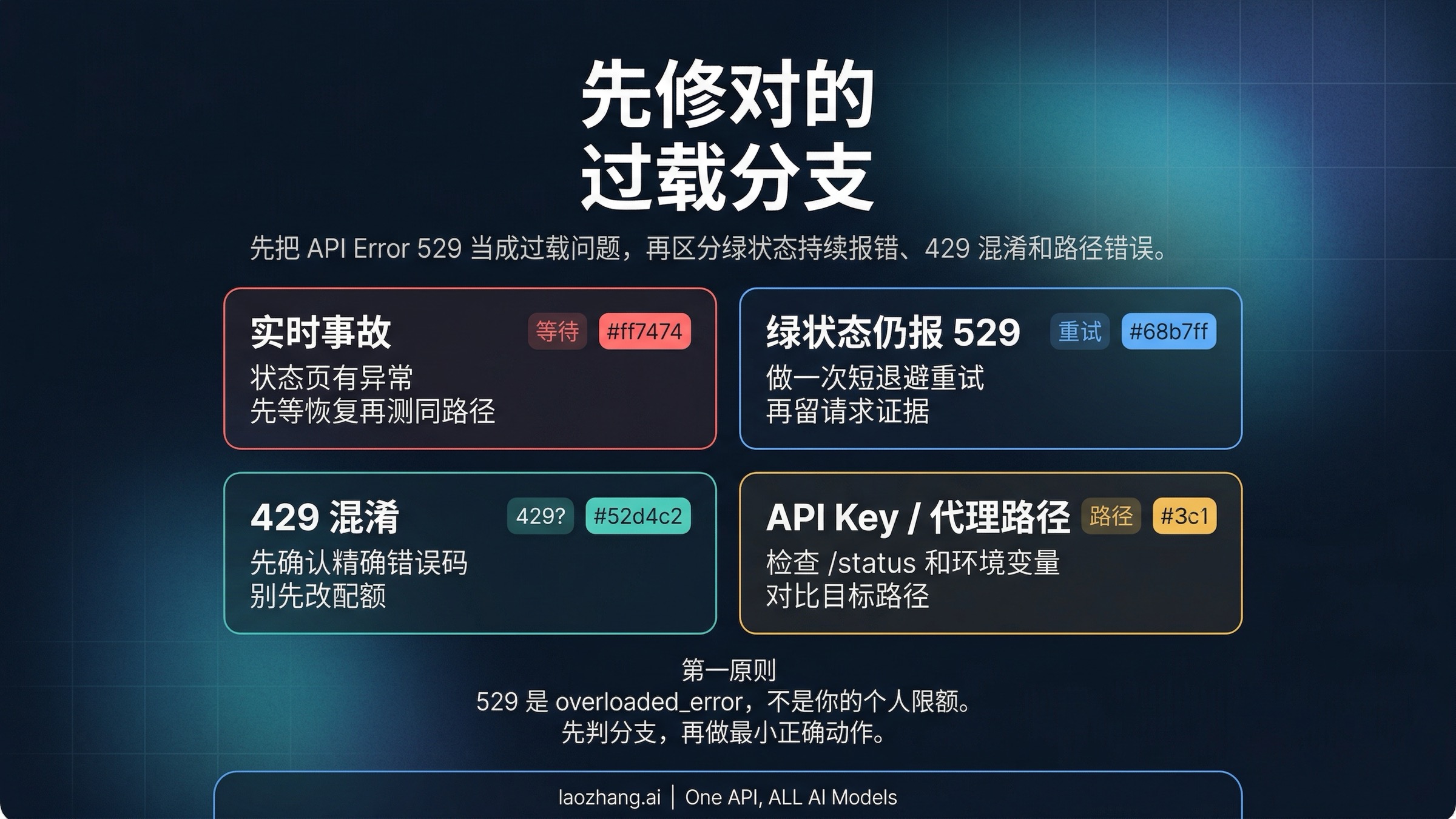 | 状态页是绿的,但同一路径还在报 529 | 短时或局部过载 | 做一次有边界的短退避重试,不要同时改一堆变量 | 确认完全相同的路径会不会自己恢复 | 多次同路径短重试后仍失败 |