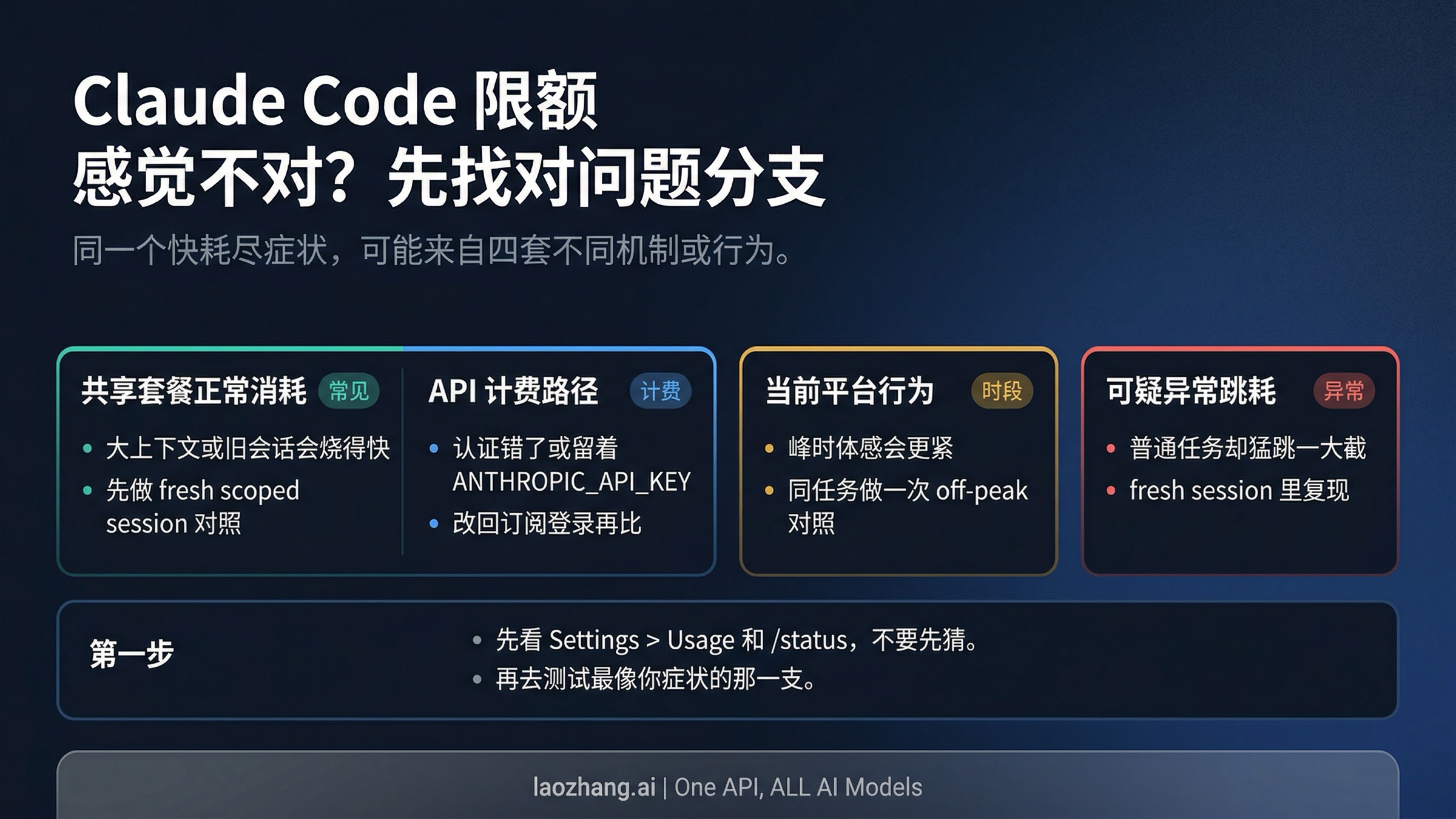 先去 Settings > Usage 和 /status 看主表,再做一个控制实验:开一个更小、更干净的新会话,或者换到非峰时重跑同类任务。只有当普通任务或 resumed session 在这个控制实验之后,仍然异常吞额度,才应该把它当成疑似异常并开始留证。