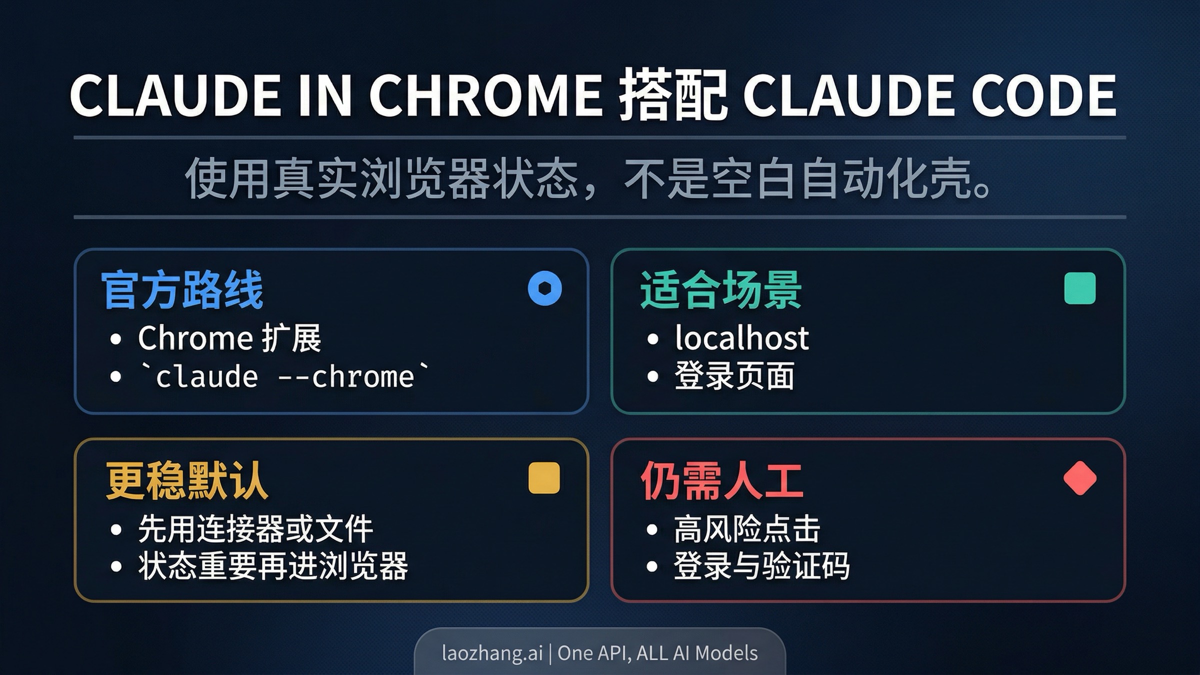 Claude in Chrome 最有价值的时刻,是浏览器正好是代码与现实之间缺失的那一层。这个工作流很强,但它应该保持窄。安装官方扩展,从 Claude Code 接上去,先验证一个真实浏览器任务,然后把它集中用在 localhost、登录态页面和浏览器验证上。只要任务不再需要浏览器,你就应该乐意退回更简单的路径。