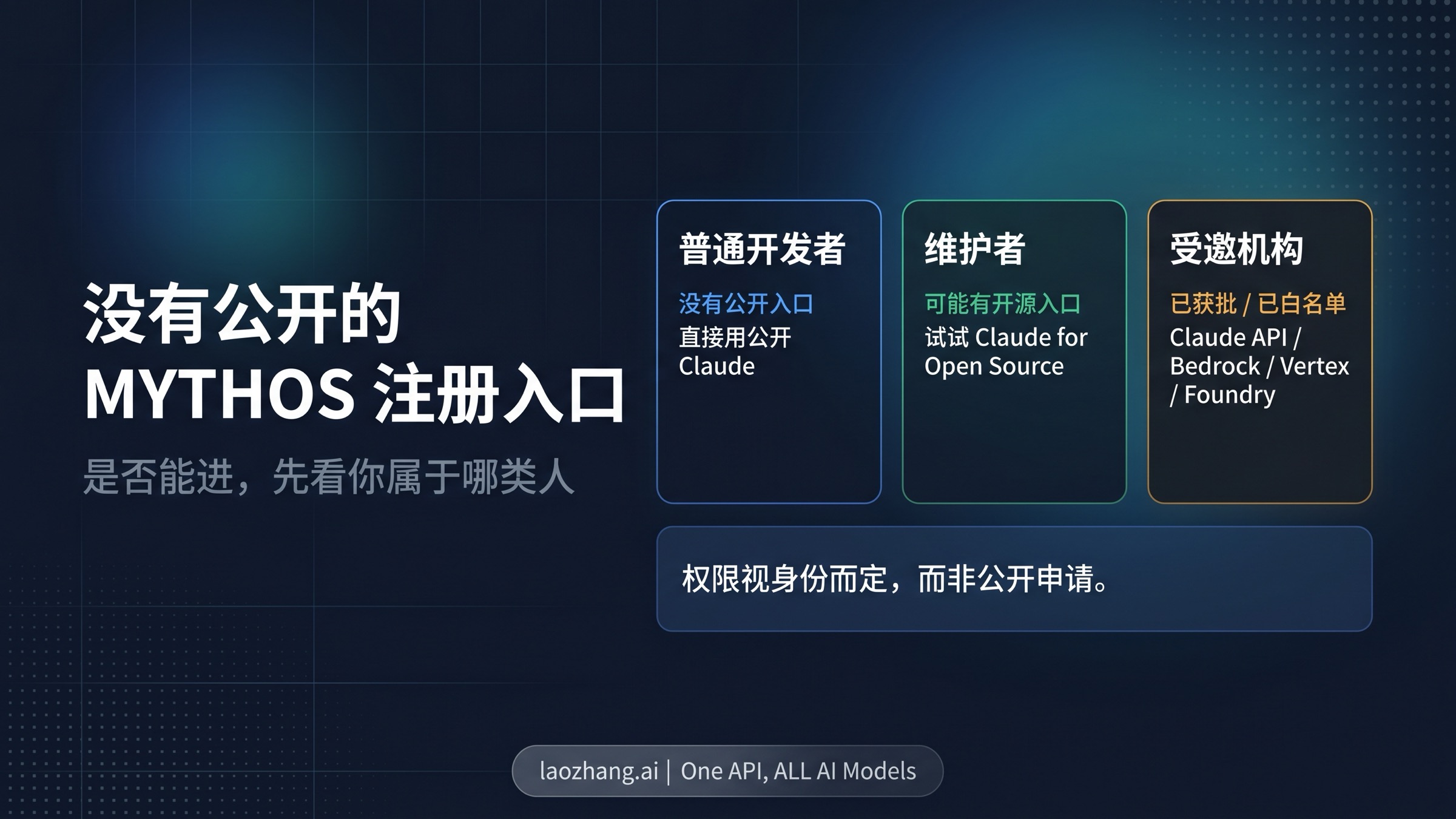 | 普通开发者、普通团队、只是想试试的人 | 没有公开路线 | 目前没有公开申请表、没有公开 waitlist,也没有控制台里的 Mythos 开关。 |