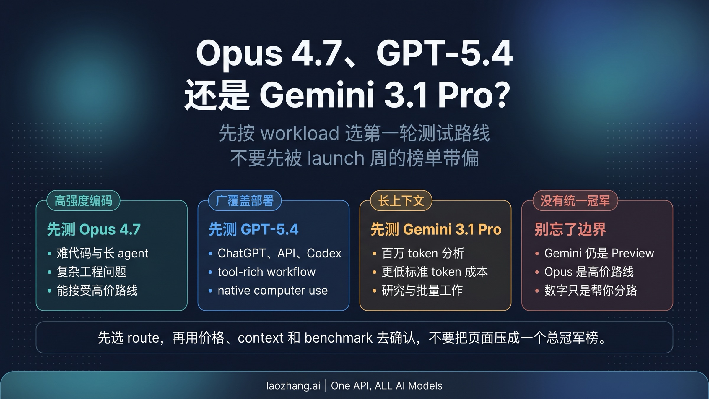 到 2026 年 4 月 18 日 为止,这三条路仍然没有收敛成一个统一答案。Gemini 3.1 Pro 还是 Preview,GPT-5.4 已经是更完整的可部署路线,Opus 4.7 则是 Anthropic 当前最明确的高端编码与 agent 路线。所以更正确的顺序不是先看榜单,而是先看工作负载。