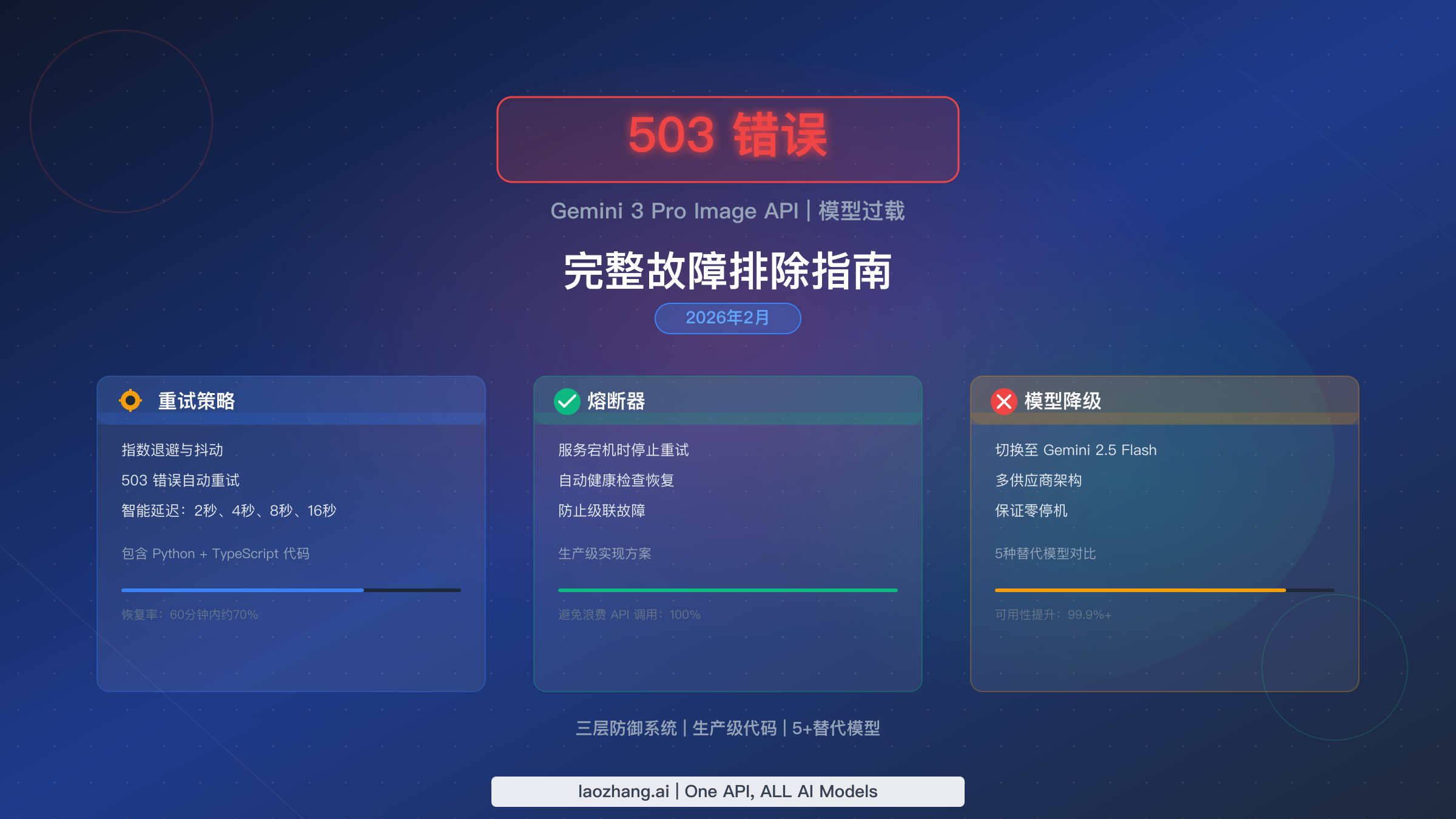 Gemini 3 Pro Image API 503「模型过载」错误意味着 Google 的服务器已达到容量上限,暂时无法处理你的请求。这是一个服务端问题,影响所有用户,无论计费等级高低,并且不是你的代码导致的。最快的修复方法是等待 5-30 分钟并实现指数退避重试,或者立即切换到 Gemini 2.5 Flash Image 作为备选方案。根据 2026 年 2 月的社区数据,大约 70% 的 503 中断会在 60 分钟内恢复,完全恢复通常需要 30-120 分钟。