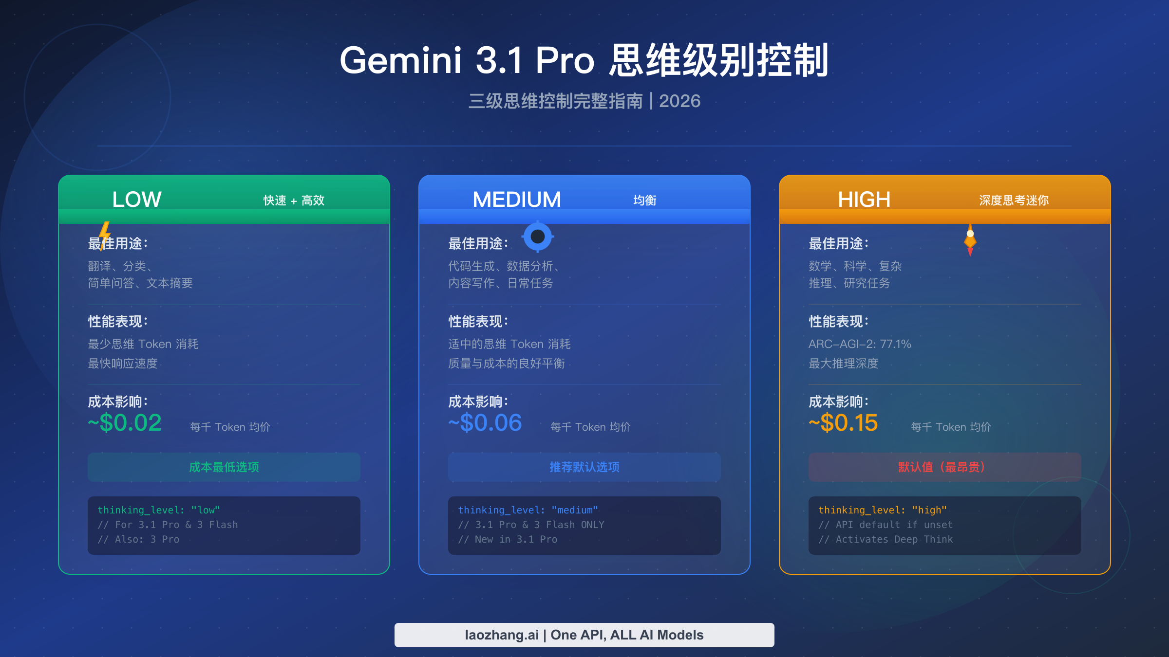Gemini 3.1 Pro 提供三个思考级别——LOW、MEDIUM 和 HIGH——通过 API 调用中的 thinking_level 参数进行配置。简单任务(如翻译和分类)设置 LOW 以获得最快速度和最低成本,日常开发使用 MEDIUM 作为默认选项实现质量与成本的平衡,复杂推理场景选择 HIGH 以激活 Deep Think Mini——这是一种在 ARC-AGI-2 上达到 77.1% 准确率的专用推理模式(2026 年 2 月,Google DeepMind)。如果不指定思考级别,API 会默认使用 HIGH——也就是最贵的选项——因此务必在每次调用中显式设置你需要的级别。