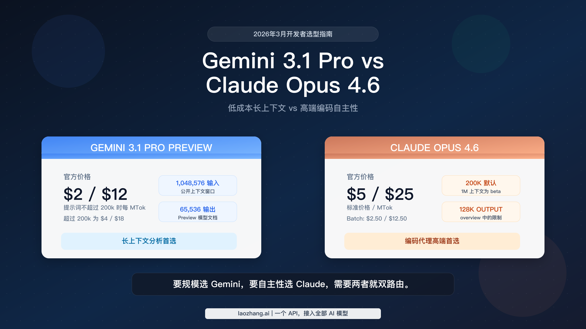 | 长文档、仓库摄入、成本敏感分析 | Gemini 3.1 Pro Preview | 官方价格更低,且百万 token 输入能力更清晰 |