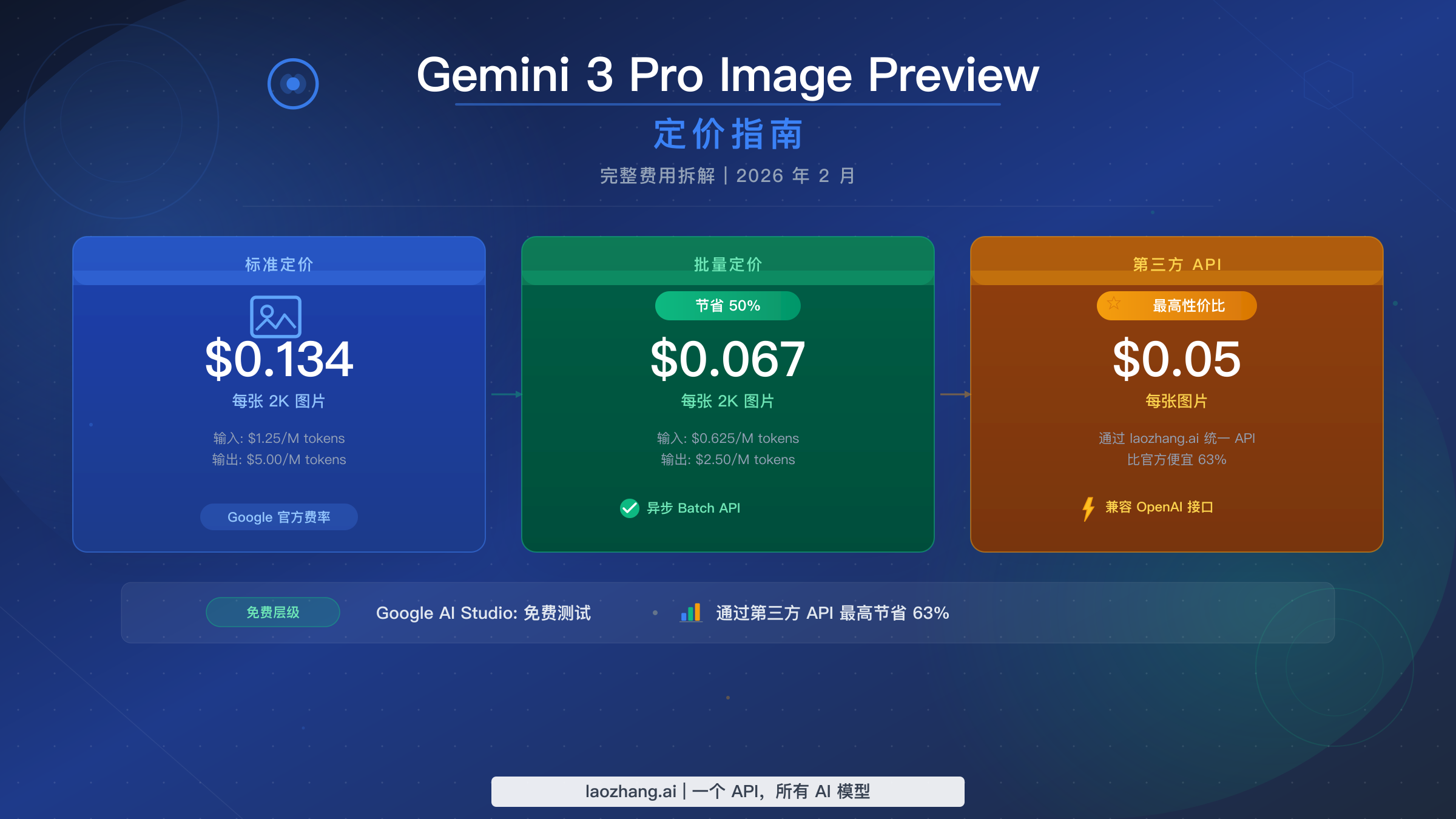 Gemini 3 Pro Image Preview 通过 Google 官方 API 的定价为:标准 2K 分辨率每张图片 $0.134,4K 分辨率每张图片 $0.24(2026 年 2 月验证,Google AI 定价页面)。虽然没有免费 API 层级,但开发者可以通过批量处理($0.067/张)或第三方服务商如 laozhang.ai($0.05/张)将成本降低最高 79%。Google AI Studio 提供免费的在线体验入口,每天可生成多达 1,500 张图片,用于测试和开发。