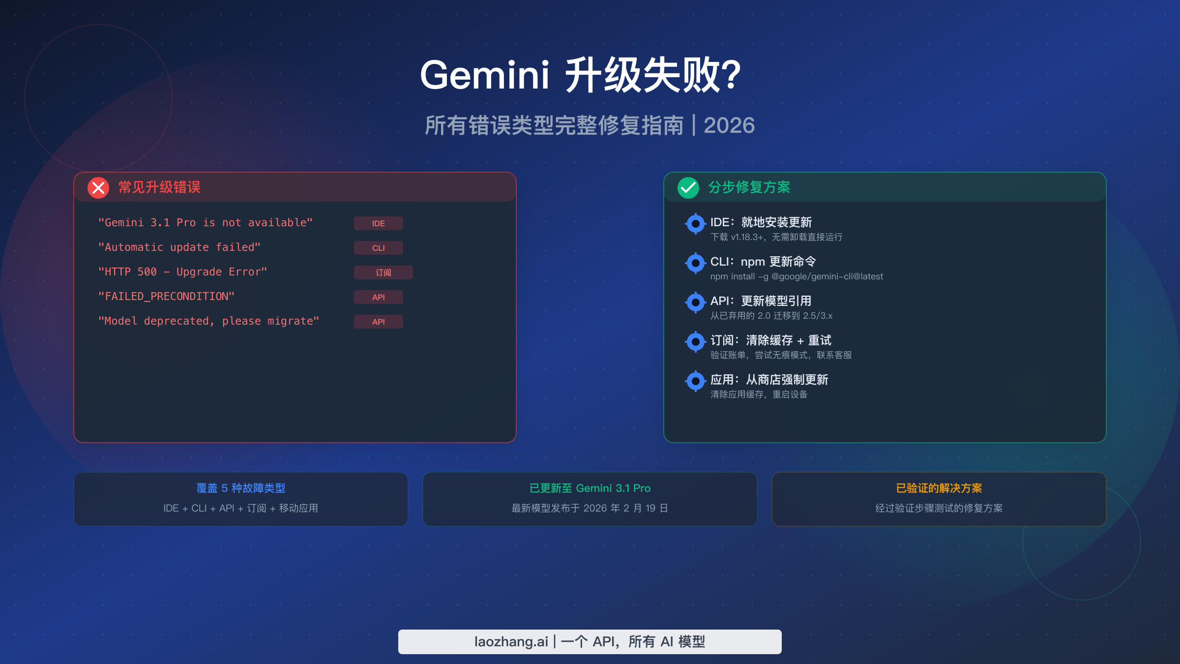 Gemini 升级失败涉及五个不同的类别:IDE 更新错误、CLI 安装失败、API 模型弃用、订阅计费问题和移动应用更新故障。对于 IDE 用户来说,最常见的修复方法是下载最新的 Antigravity 安装程序(v1.18.3 或更高版本)并执行原地升级,无需先卸载。对于 CLI 用户,运行 npm install -g @google/gemini-cli@latest 可以解决大多数更新问题。随着 Gemini 3.1 Pro 于 2026 年 2 月 19 日发布,许多用户遇到了需要根据具体失败类型采取针对性解决方案的版本特定错误。