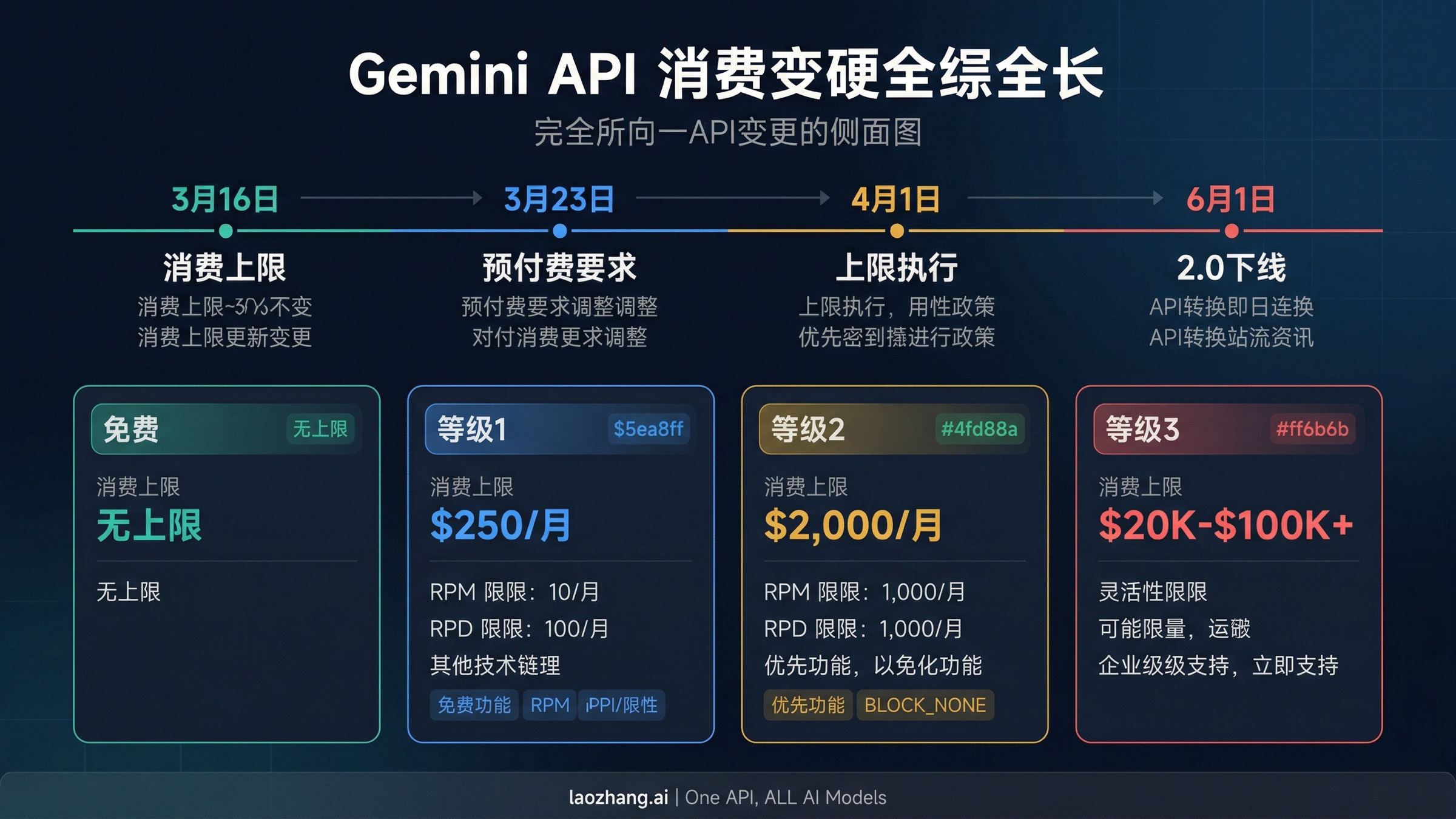 2026 年 4 月 1 日是影响最大的日期。从这天起,Google 将在结算账户级别为每个使用等级强制执行最高月度消费限额。与可选的项目级上限不同,这些等级上限是强制性的且无法关闭。如果你在某个结算账户下所有项目的总支出达到了你所在等级的上限,该账户下的所有 Gemini API 请求将被暂停,直到下一个计费周期开始(ai.google.dev/docs/billing,2026 年 3 月)。