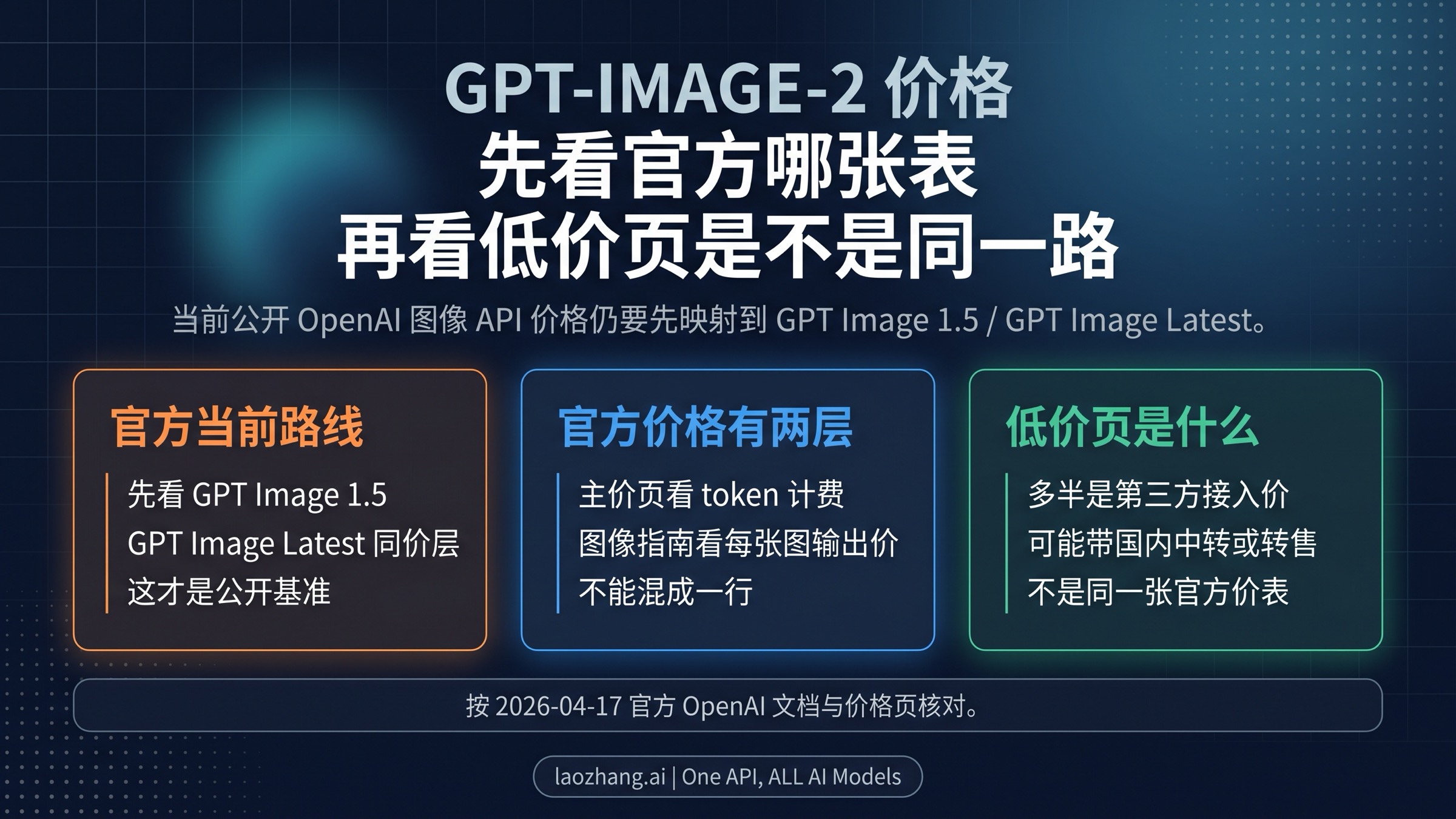 看到 gpt-image-2 这个名字时,不要直接把它当成当前公开 OpenAI 官方价格行。今天核对官方价格,先看的是 gpt-image-1.5 / GPT Image Latest,不是另一张隐藏的官方低价表。