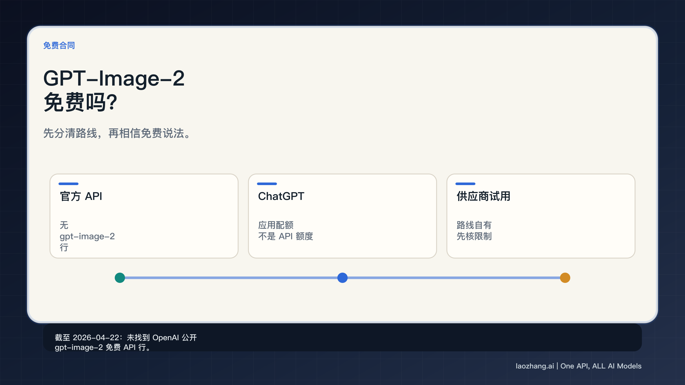 不免费。更准确地说,当前没有公开证据证明 OpenAI 官方 API 有一个免费的 gpt-image-2 路线;公开文档仍应按 GPT Image 1.5 / GPT Image Latest 判断。