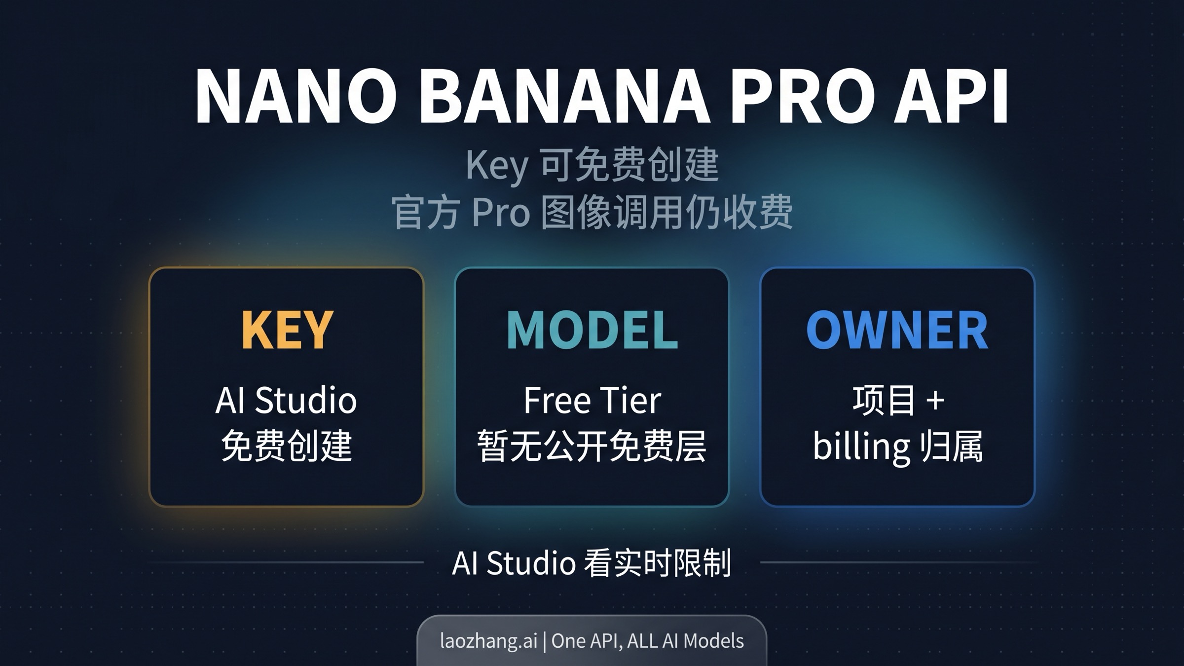 如果你今天只想知道一句最短的判断,那就是:Key 可以免费创建,但官方 Pro 图像 API 目前不是免费层;真正决定你能不能调、怎么扣费的,是 Key 背后的项目和 billing account;而 AI Studio 才是看实时限制的地方。