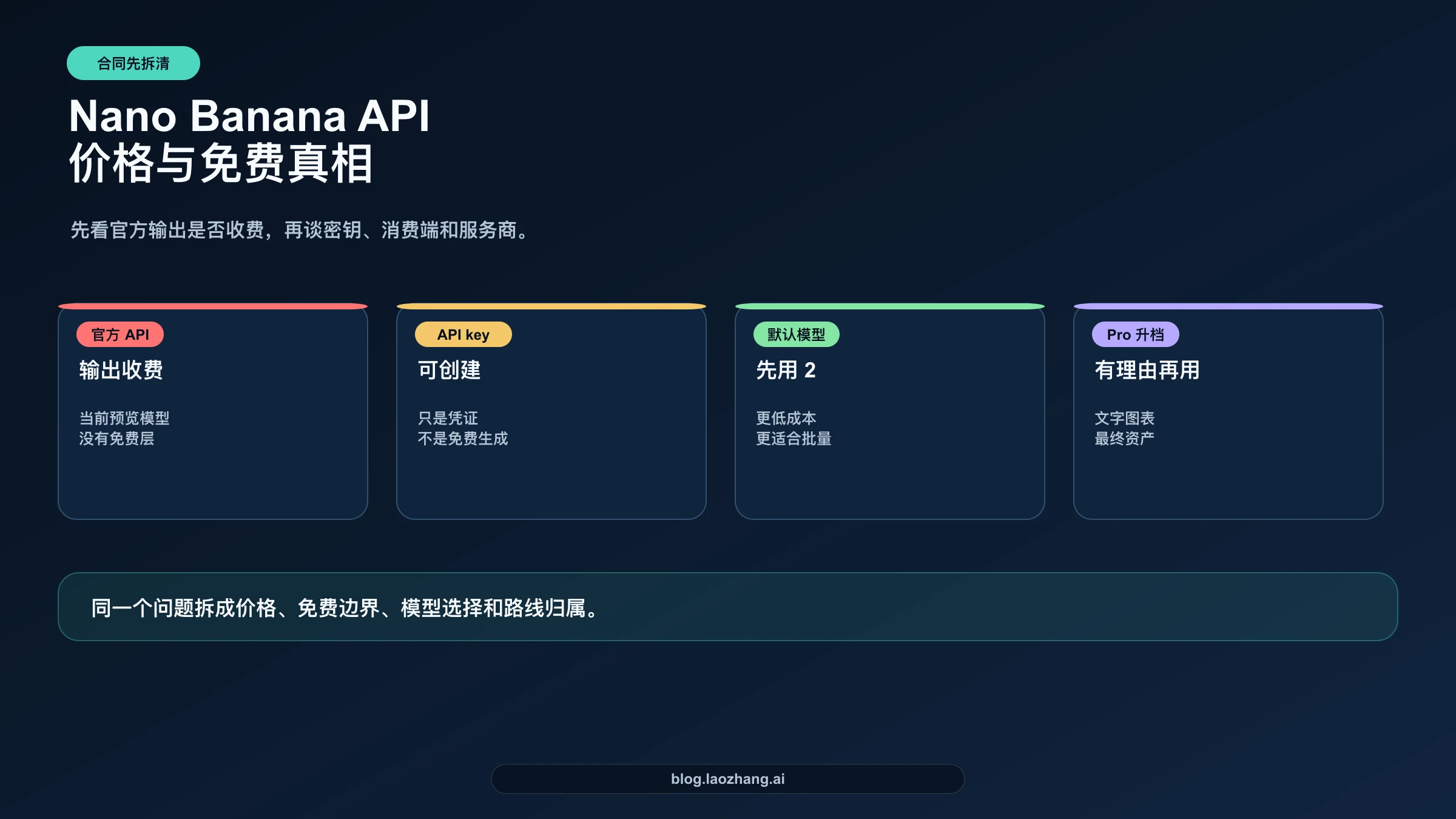 但这不等于所有 Nano Banana 入口都收费。API key 创建、Gemini 或 Flow 里的消费端体验、服务商赠送额度、Google 官方 API 输出,是四份不同合同。把它们混成一句“免费 API”,会直接误导预算和接入路线。