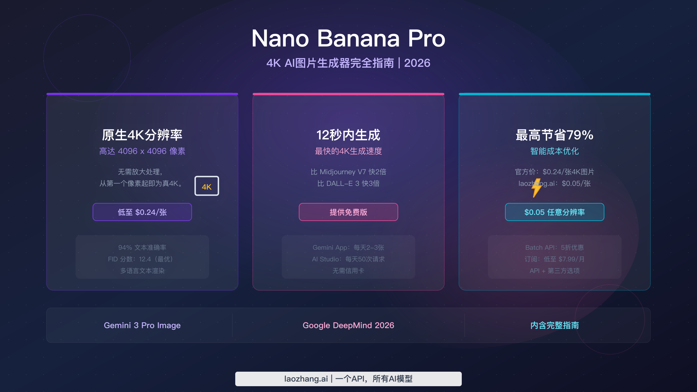 Nano Banana Pro(Gemini 3 Pro Image)可在12秒内生成高达4096x4096像素的原生4K图片,文本渲染准确率超过94%。官方API定价从2K图片$0.134起,4K图片$0.24/张(2026年3月),而laozhang.ai等第三方平台提供统一$0.05/张的价格——最高节省79%。通过Google AI Studio(50次/天)和Gemini App(2-3张/天)可免费使用。