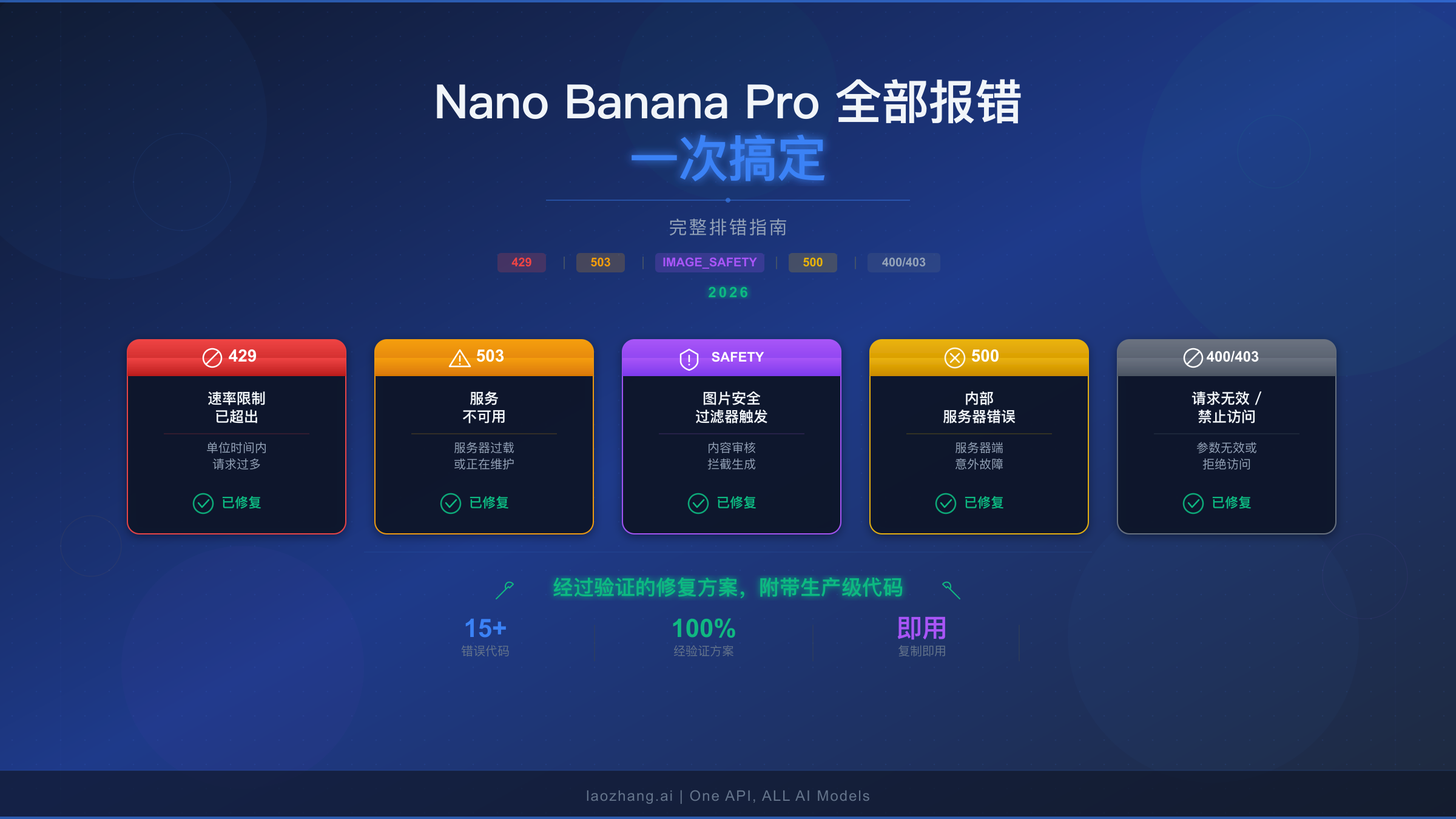 Nano Banana Pro 报错可能在毫无预警的情况下中断你的 AI 图片生成工作流,但每一种错误都有对应的解决方案。根据 2026 年 2 月开发者社区的报告,速率限制错误(HTTP 429)约占所有 Nano Banana Pro 故障的 70%,其次是服务器过载错误(503/502)约占 15%,身份验证问题(403)约占 8%,安全过滤器、内部错误和请求格式问题合计约占剩余的 7%。本指南将帮助你精准定位你的错误类型,从基础设施层面理解错误产生的原因,并给出正确的修复方案——附带可以直接复制到项目中使用的生产级代码。