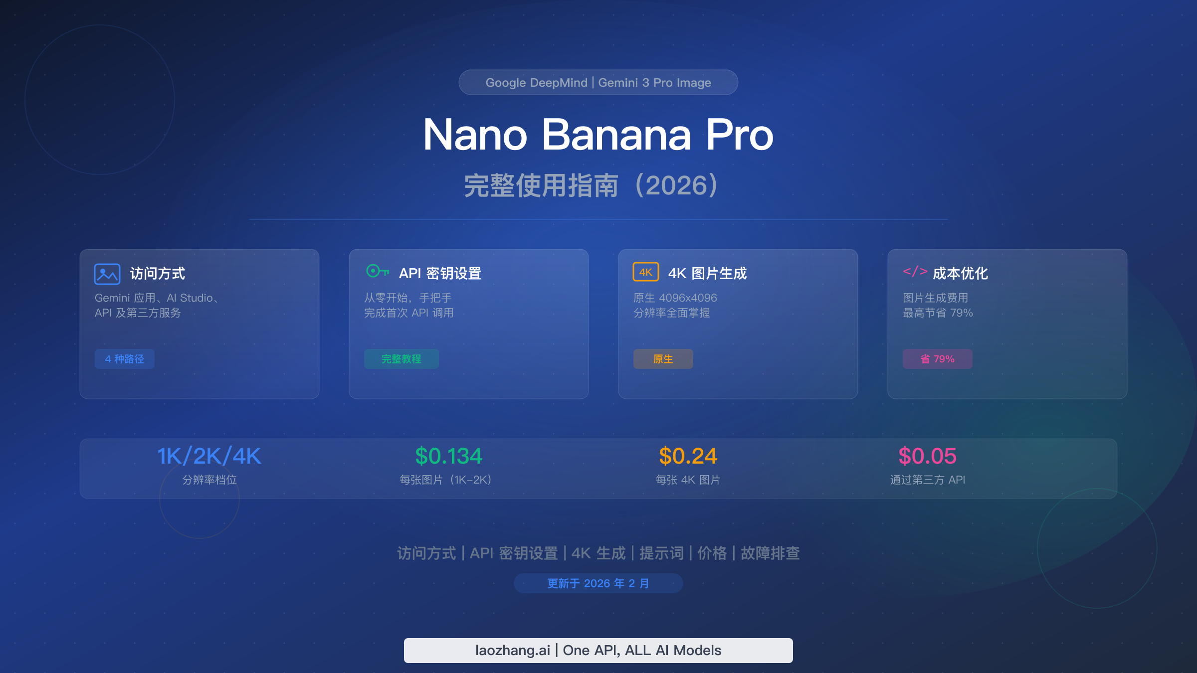 Nano Banana Pro,官方名称为 Gemini 3 Pro Image,是 Google DeepMind 最先进的 AI 图片生成模型,能够输出原生 4K 分辨率图像,并在多种语言中实现出色的文字渲染效果。你可以通过 Gemini 应用免费使用它,在 Google AI Studio 中进行交互式实验,或通过 Gemini API 以编程方式集成——1K-2K 分辨率的图片价格为每张 $0.134,4K 图片为每张 $0.24(Google AI,2026 年 2 月)。第三方 API 提供商如 laozhang.ai 则以每张 $0.05 的价格提供相同模型。本指南将带你了解每种访问路径、API 密钥设置、4K 生成技巧以及成本优化策略。