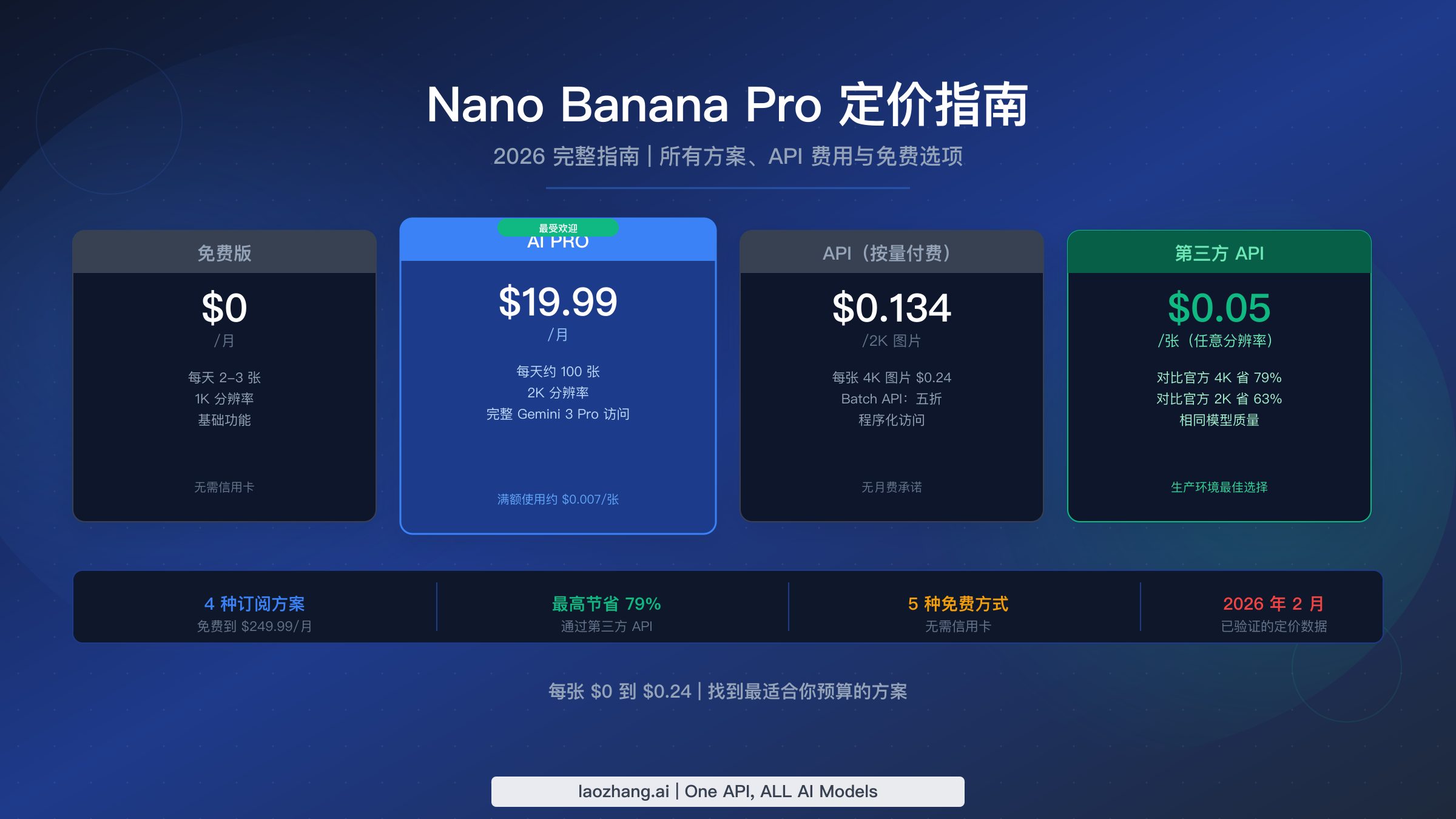 Nano Banana Pro 通过 Google 官方 API 的定价为每张 2K 图片 $0.134,4K 图片每张 $0.24。如果你倾向于订阅方案,Google 提供四个等级:免费方案每天 2-3 张图片、AI Plus $7.99/月、AI Pro $19.99/月、AI Ultra $249.99/月。对于希望最大限度降低成本的用户,第三方 API 提供商以低至每张 $0.05 的价格提供相同的 Nano Banana Pro 模型,相比官方 4K 定价最高可节省 79%。本指南中的所有定价数据均已于 2026 年 2 月核实官方来源。