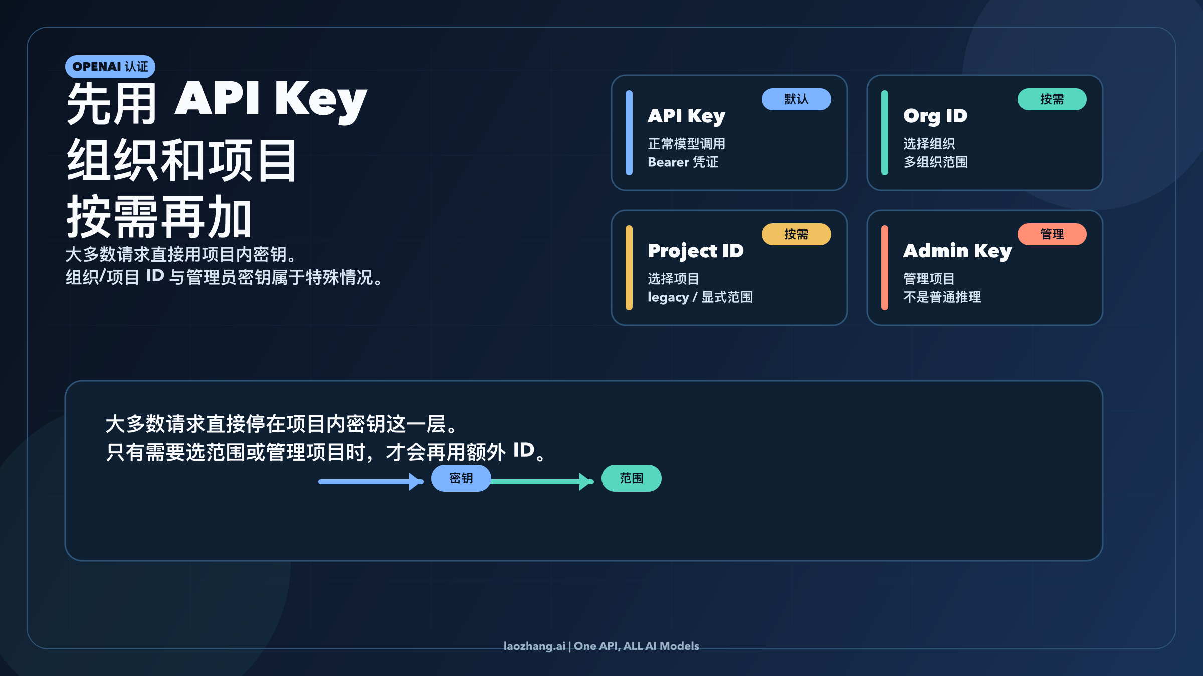 这句话看起来不大,却几乎能解开整个话题。接受这个模型之后,今天的 OpenAI 平台就不再像一堆重叠字段。project-scoped key 是普通应用请求的默认路径;org 和 project IDs 是按需出现的显式路由控制;admin keys 也会回到它本来的位置上:管理平面的凭证,而不是 OpenAI 认证的通用答案。
