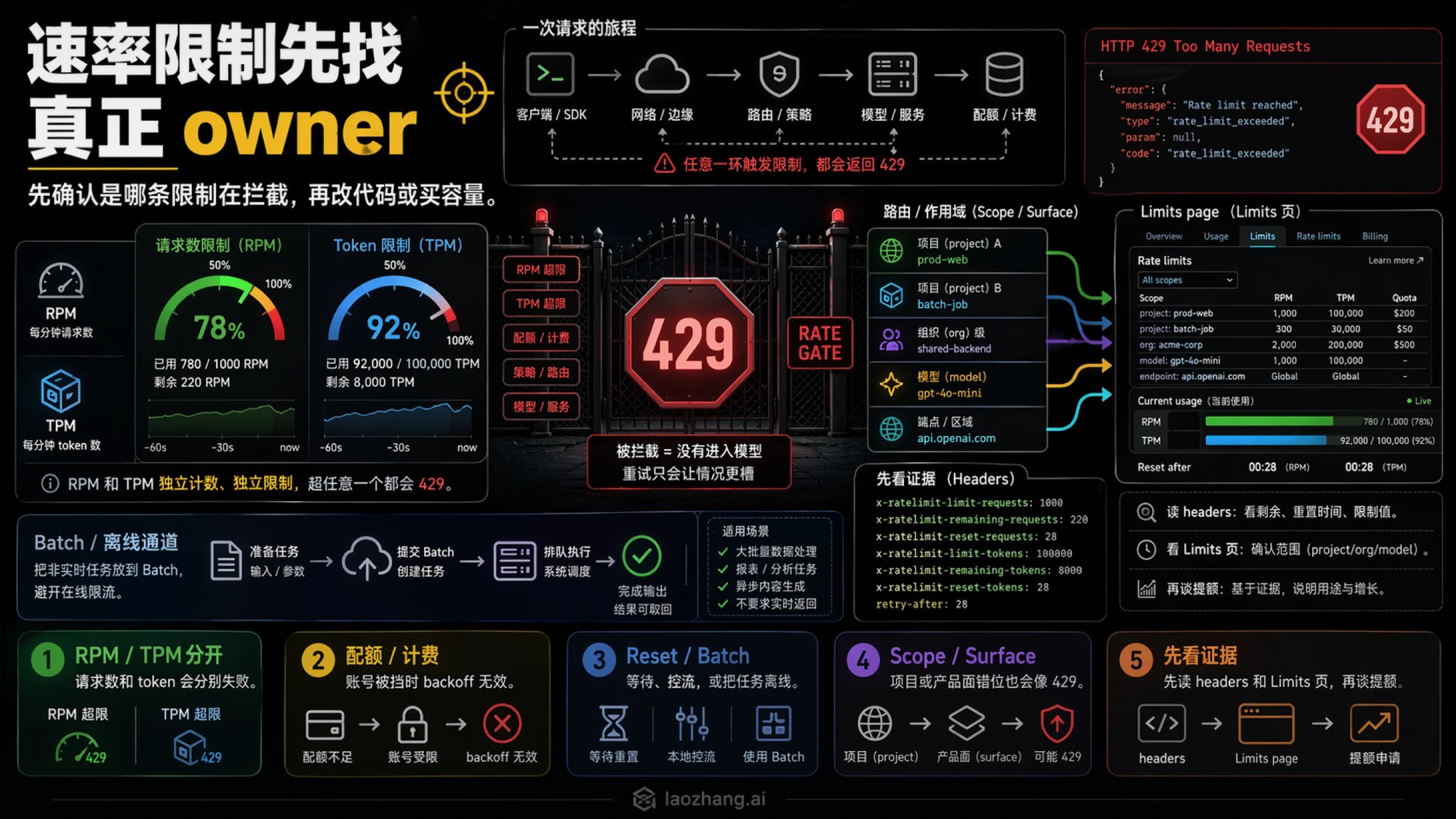 OpenAI API 429 先不要当成“多试几次”的问题。它更像一个分流信号:你的请求可能撞到了请求速率、token 速率、quota 或计费状态、project 或 model scope,或者你根本把 ChatGPT / Codex 这类产品面的限制误当成了 OpenAI Platform API 的限流。真正更快的处理顺序是先读 owner,再读 reset,再做最小修复动作。