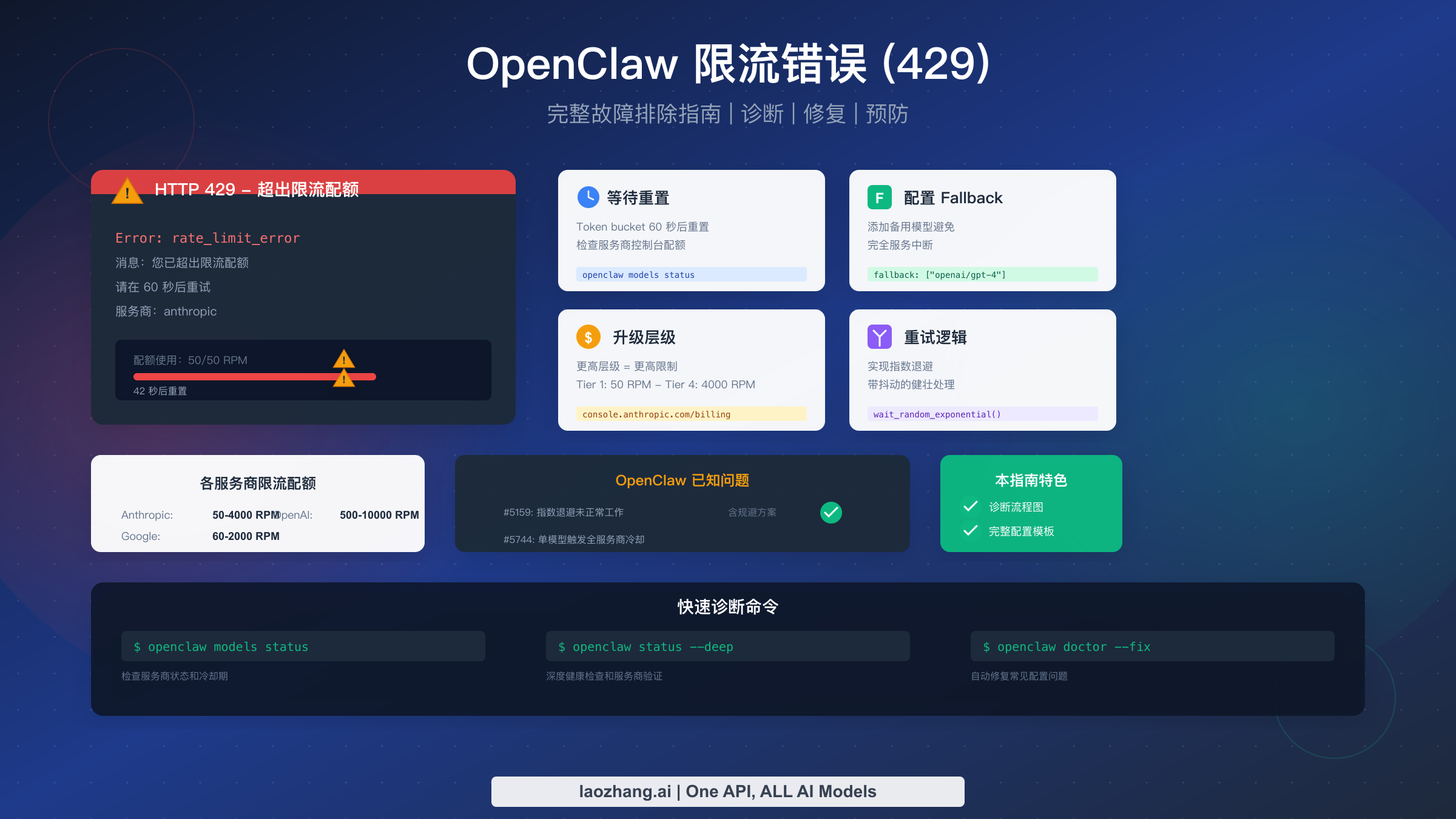 openclaw models status(检查冷却期),openclaw status --deep(验证服务商),openclaw doctor --fix(自动修复)
