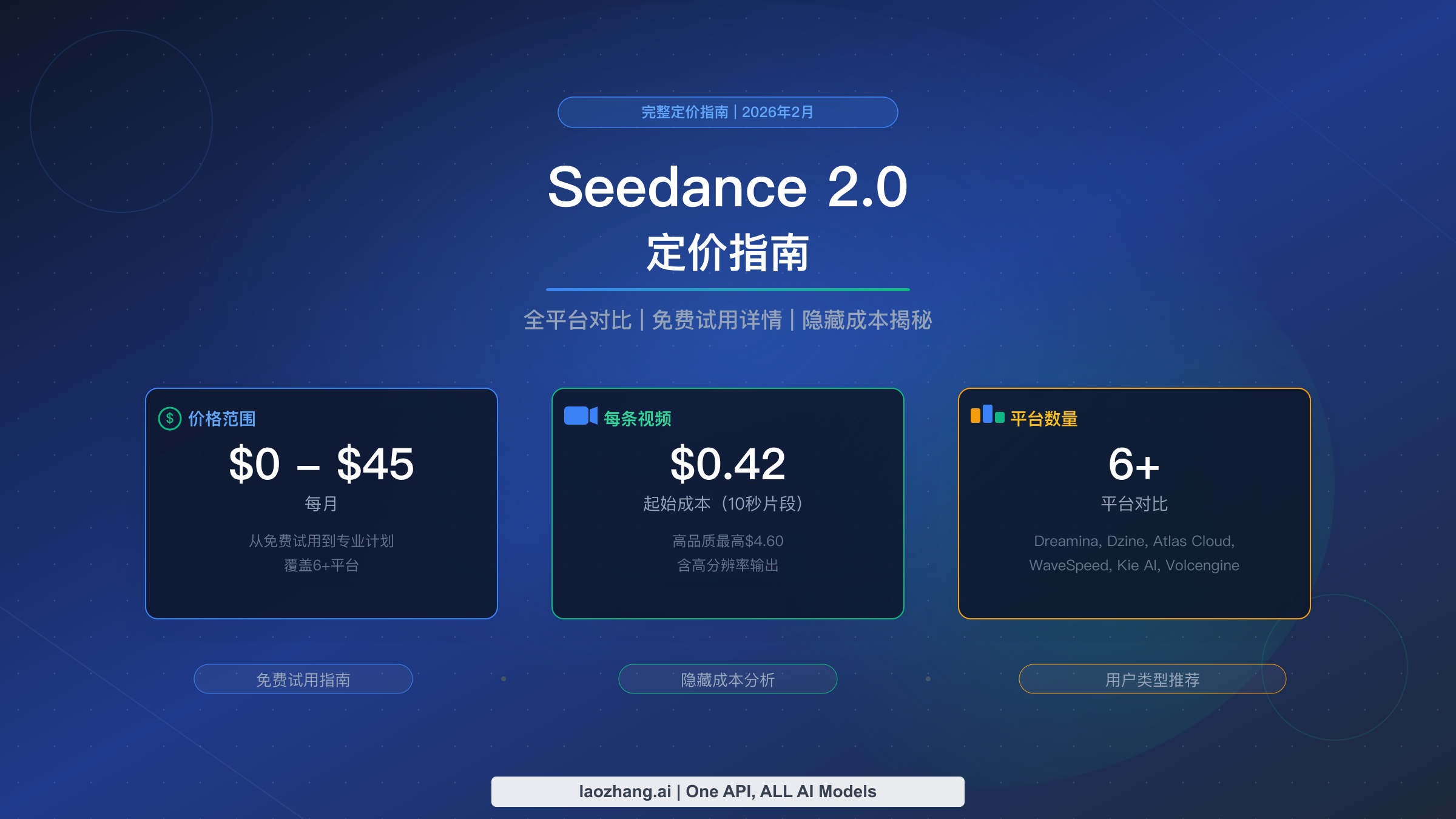 Seedance 2.0 的价格从免费到每月 $45 不等,具体取决于你选择的平台和套餐方案。在字节跳动的官方消费级平台 Dreamina 上,基础会员月费约为 69 元人民币(约 $9.60),而生成一条 10 秒视频的成本从 $0.42 到 $4.60 不等。火山引擎和小云雀等多个平台提供带有有限额度的免费试用,让你无需花费即可体验 Seedance 2.0。本指南将对比所有主要平台的定价方案,揭示可能让你的账单翻 9 倍的隐藏成本,并根据你的具体需求推荐最佳方案。数据截至 2026 年 2 月。