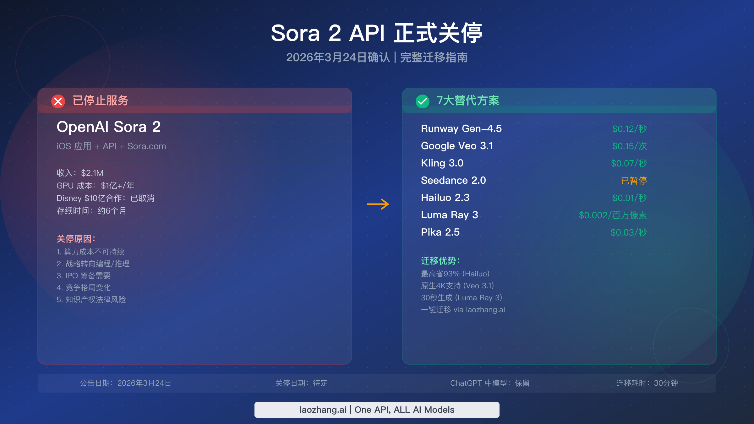 Sora 2 API 已于2026年3月24日确认即将关停。以下是你需要掌握的核心信息: