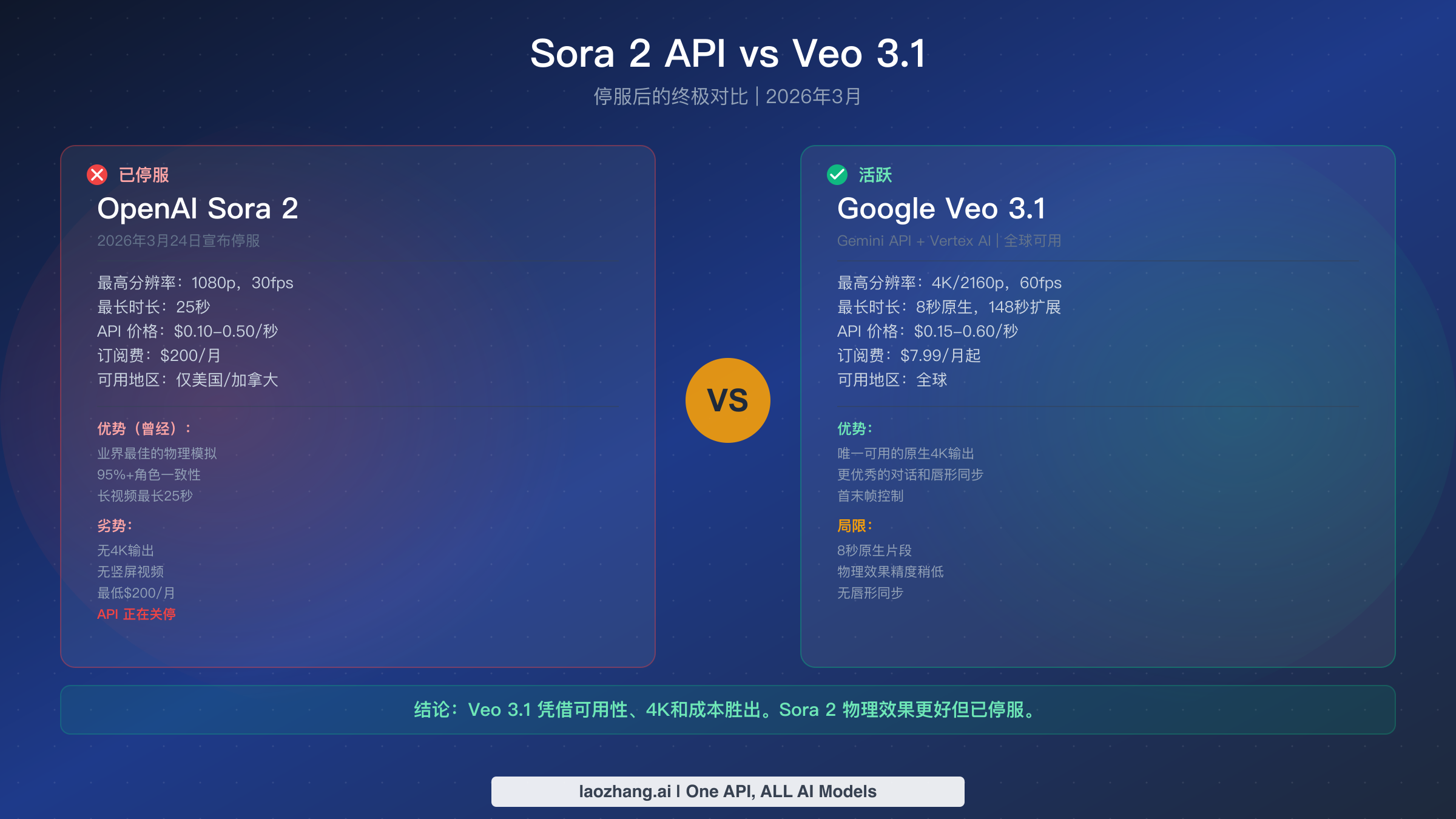 所有在2026年3月24日之前发布的 Sora 2 与 Veo 3.1 对比文章,现在都已经从根本上过时了。就在那一天,OpenAI 确认彻底关停 Sora 应用程序、API 和 Sora.com 平台。这让对比的性质从"你该选哪个"变成了"你正在迁移到的是什么"。Veo 3.1 在11项功能维度中赢得7项,订阅层面成本最高可降低96%,而迁移只需不到30分钟,仅需修改两行代码。