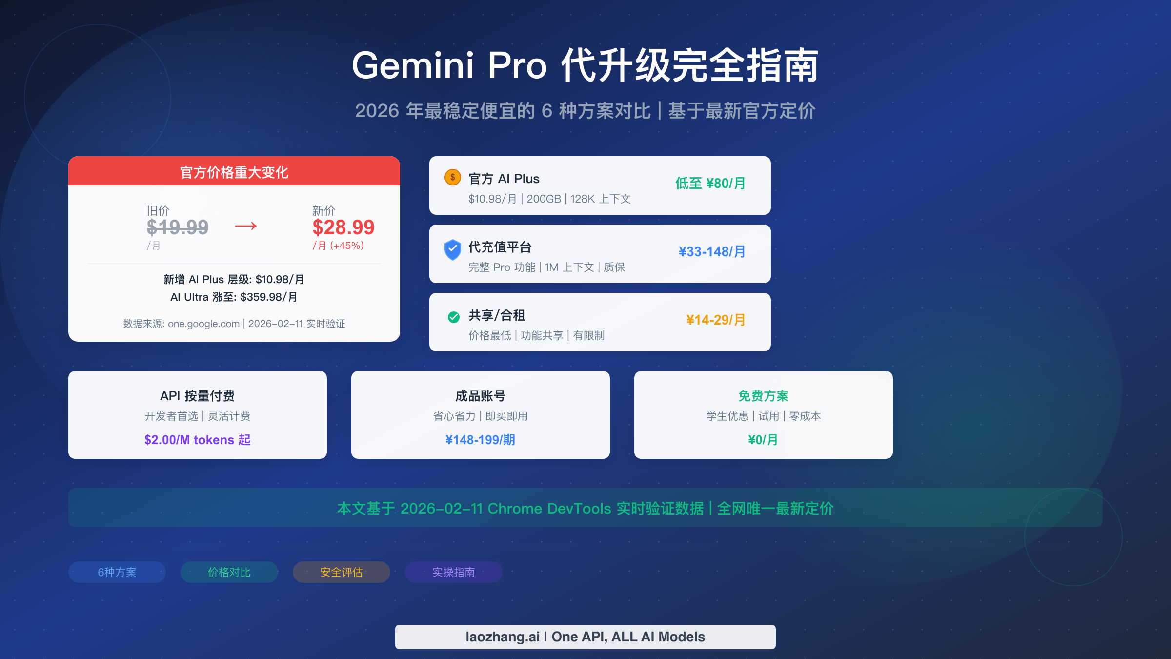 Gemini Pro 官方订阅价格已在 2026 年初从 $19.99 上调至 $28.99/月(约 210 元),且新增了 $10.98/月的 AI Plus 入门层级。对于国内用户来说,代充值是目前最主流的升级方式,月均成本可低至 33 元起。本文基于 2026 年 2 月最新数据,系统对比 6 种升级方案的价格、稳定性和安全性,帮你找到最适合的方案。